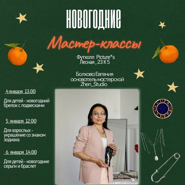▌ 🎄 4 января, 13:00—15:00 Мастер-класс для детей: Создаем волшебные новогодние брелоки с подвесками своими руками. Стоимость участия: 600 рублей (Материалы включены в стоимость). ⎯⎯⎯⎯⎯⎯⎯⎯⎯⎯ ▌ ⭐ 5 января, 12:00—14:00 Мастер-класс для взрослых: Под руководством Болховой Евгении создаем эксклюзивные украшения со знаками зодиака: оригинальную брошку - брошь или изящную цепочку с подвесами. Стоимость участия: 1500 рублей. (Материалы включены в стоимость). ⎯⎯⎯⎯⎯⎯⎯⎯⎯⎯ ▌ ✨ 6 января, 14:00—16:00 Мастер-класс для детей: Делаем яркие праздничные серьги и стильный браслет, подходящие для Нового Года и Рождества. Стоимость участия: 700 рублей (Материалы включены в стоимость). ⎯⎯⎯⎯⎯⎯⎯⎯⎯⎯ 👉 Место проведения: Футхолл Пикчерс, ул. Лесная, д. 23, корп. 5 📝 Запись производится в личных сообщениях @zhen_studio, 89639143229 Присоединяйтесь и подарите себе и детям приятные эмоции вместе с уникальной творческой атмосферой!