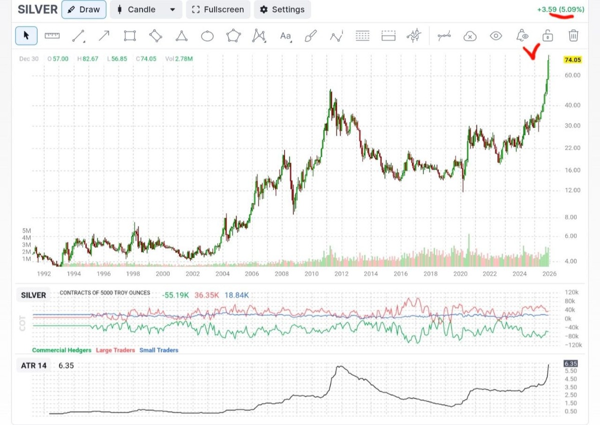 Исключительная волатильность серебра в последние дни привлекла всеобщее внимание — даже Илон Маск отметил яростное ралли металла. В начале недели серебро взлетело до рекордных $84 за унцию, но вчера так же стремительно рухнуло до $70 на тонком послепраздничном рынке. Это был один из самых сильных ценовых разворотов в истории. Несмотря на это, с начала года металл подорожал примерно на 140%. Главный вопрос: что дальше? Вот ключевые факторы, за которыми стоит следить: 1. Китайский спрос Одной из главных движущих сил недавнего ралли стал резкий рост интереса со стороны инвесторов в Китае. Спекулянты массово вкладывались в драгоценный металл, создавая ажиотаж, похожий на тот, что наблюдался в платине. Повышенные закупки на Шанхайской золотой бирже привели к тому, что премия на серебро в Китае достигла рекордного уровня, потянув за собой и мировые цены. Стремительное ралли заставило единственный в стране «серебряный» фонд на прошлой неделе прекратить прием новых клиентов. Многочисленные