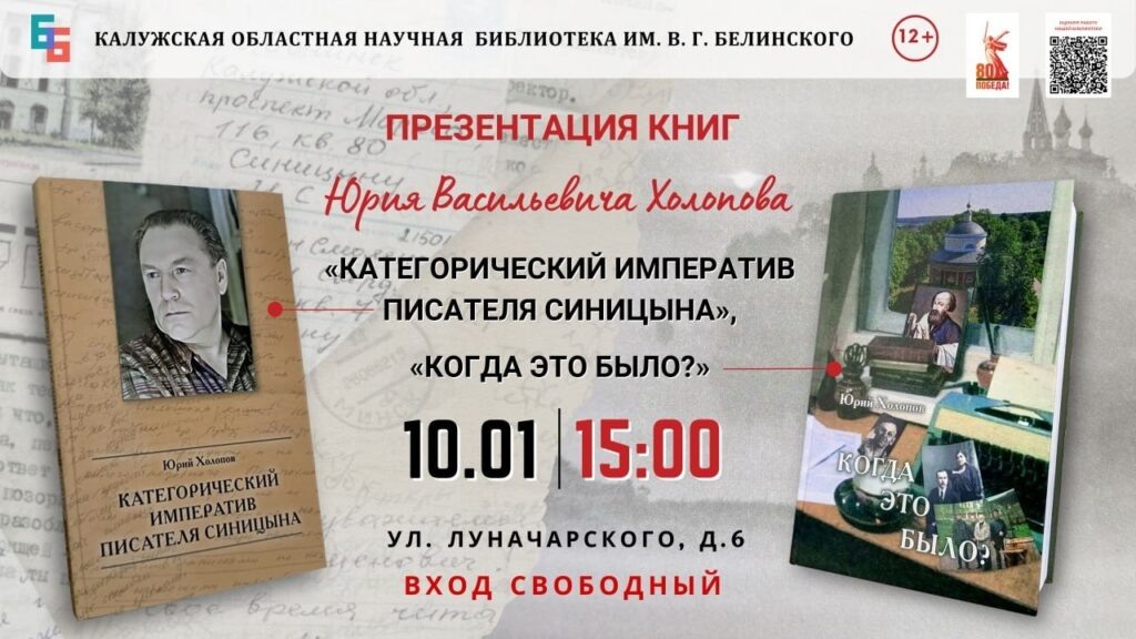 Калужская областная научная библиотека им. В.Г. Белинского приглашает всех ценителей литературы, истории и краеведения на значимое культурное событие начала года. 10 января 2026 года в зале «Губернаторская библиотека» состоится презентация двух новых книг писателя и исследователя Юрия Васильевича Холопова, посвященных важным страницам региональной истории и судьбам выдающихся калужан. Мероприятие откроет цикл литературных событий 2026 года и станет площадкой для живого диалога о прошлом и настоящем Калужского края. Начало встречи запланировано на 15:00. Вход на презентацию свободный для всех желающих. Центральным событием вечера станет представление биографической документальной повести «Категорический императив писателя Синицына». Эта книга посвящена жизни и творческому пути Ивана Семёновича Синицына (1917–1998) — яркой фигуры в истории калужской журналистики и литературы. Участник Великой Отечественной войны, талантливый публицист, он вошел в историю региона как первый редактор облас