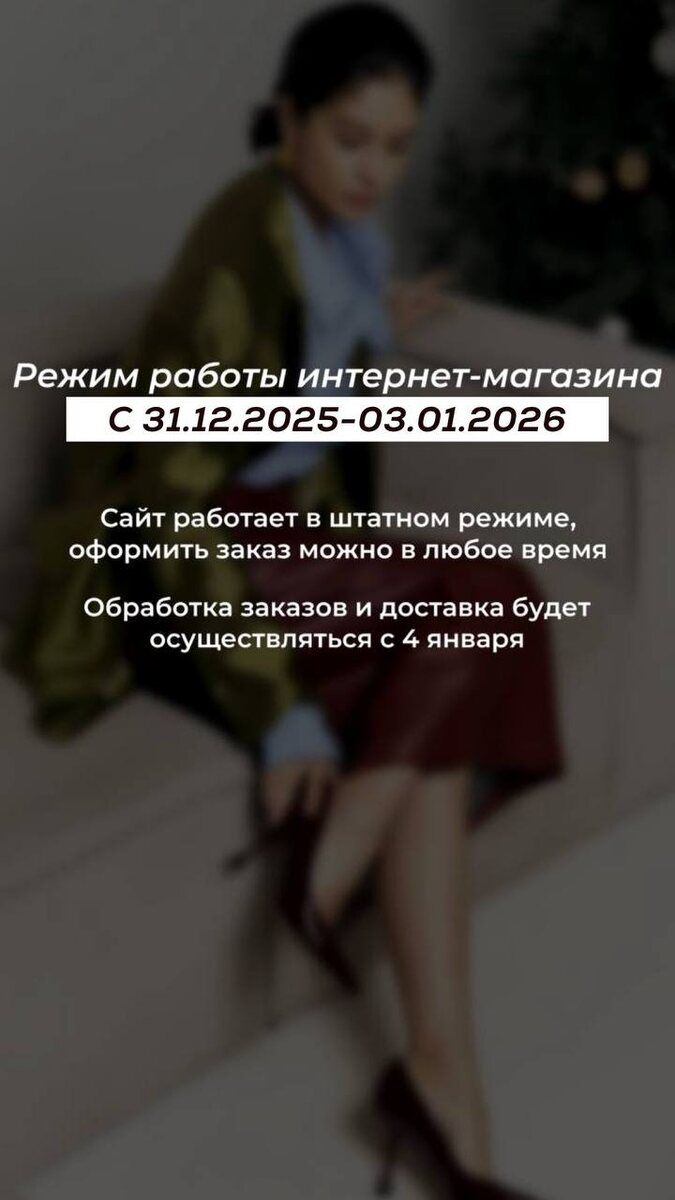 : 📌Сайт работает в штатном режиме, оформить заказ можно в любое время Обработка заказов начинается с 03.01. 📌Доставка будет осуществляться с 04.01. Оффлайн магазины частично начинают работу с 01.01. (подробный режим работы по каждому ТЦ смотрите на фото) Вопросы по доставке, оформлению и статусу заказа, оплате в интернет- магазине по номеру: 8 (981) 047-70-05 Или @kristina_milan_com
