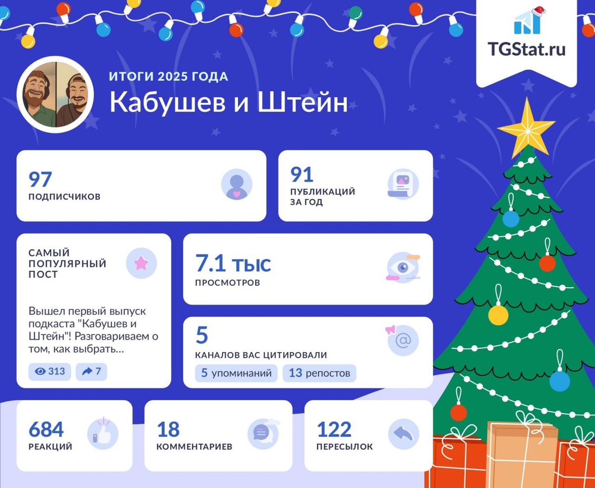 🙏 В этом году мы начали вести подкаст и старались писать посты каждую неделю для вас — и вот результат! Мы очень вам признательны за то, что подписываетесь на нас и делитесь нашими постами. Уже завтра мы запишем финальный выпуск первого сезона "Кабушева и Штейна", а после праздника вернёмся к вам со свежими силами. С наступающими вас, дорогие читатели, слушатели и зрители!