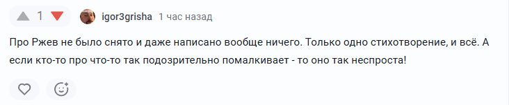 Под статьей с разбором фильма "Ржев" мне написали, что дескать в советское время про Ржевскую битву ничего не писали и не снимали, а если "кто-то про это подозрительно помалкивает" значит стопудово тут дело нечисто. Ну на самом деле, про Ржевскую битву в советское время писали, и не только одно стихотворение. Для примера есть очерк Александра Полякова датированный 1943 годом, который так и называется «Под Ржевом». Имеется сборник 1973 года под названием "В боях за Ржев", в аннотации книги сказано: "В мемуарной и художественной литературе о Великой Отечественной войне часто упоминаются бои за Ржев. Однако сколько-нибудь полного описания сражения,