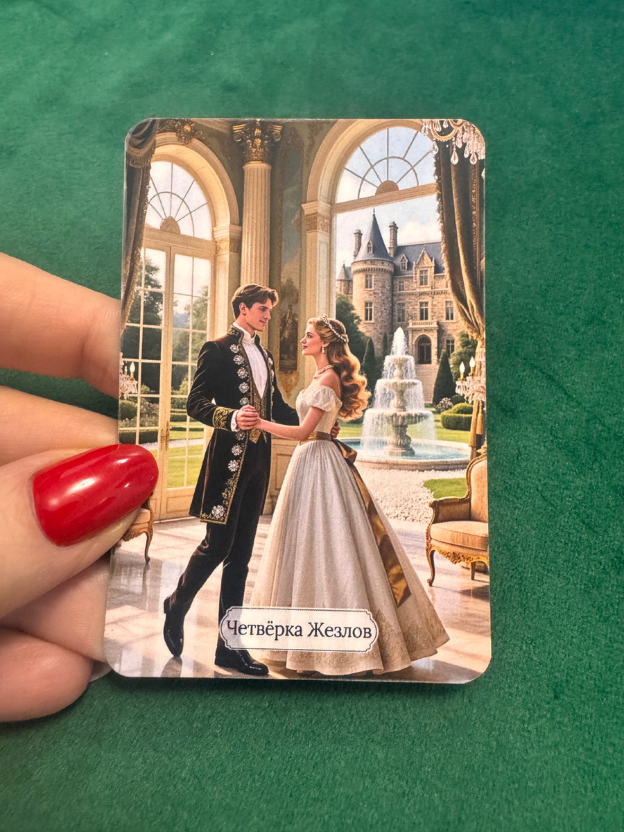 Представь уютный дом, украшенный цветочными гирляндами, где царит атмосфера праздника, покоя и сердечного тепла. Четвёрка Жезлов — это именно та карта! Она пришла как первый и самый важный сигнал: ты не просто случайный образ в его памяти.