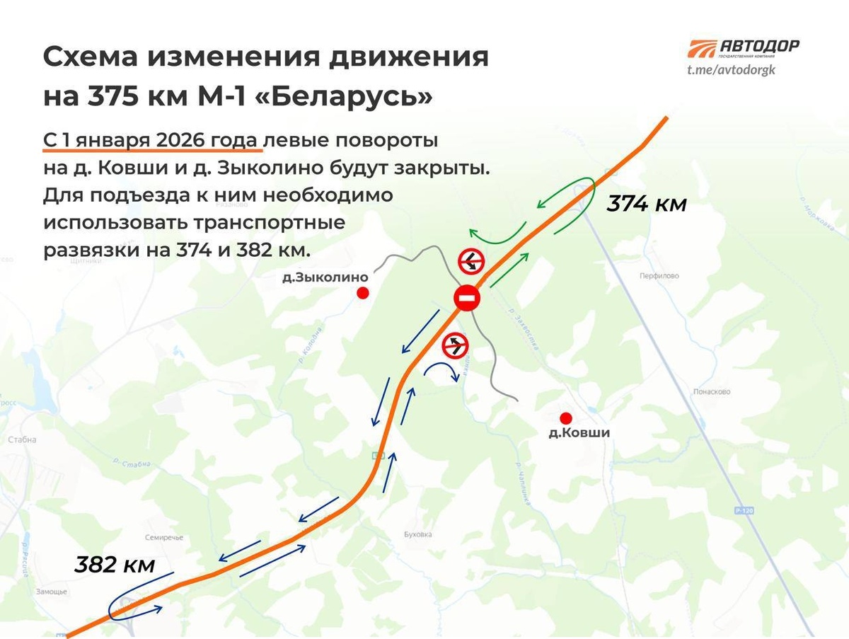 С 1 января 2026 года на 375 км трассы М-1 «Беларусь» левые повороты на д. Ковши и д. Зыколино будут закрыты. 🚗 Для подъезда к этим населенным пунктам необходимо использовать ближайшие транспортные развязки на 374 и 382 км. Изменение вводится на постоянной основе и направлено на повышение безопасности дорожного движения. ⚠ Просим автомобилистов быть внимательными в пути, соблюдать скоростной режим и заранее планировать маршрут.