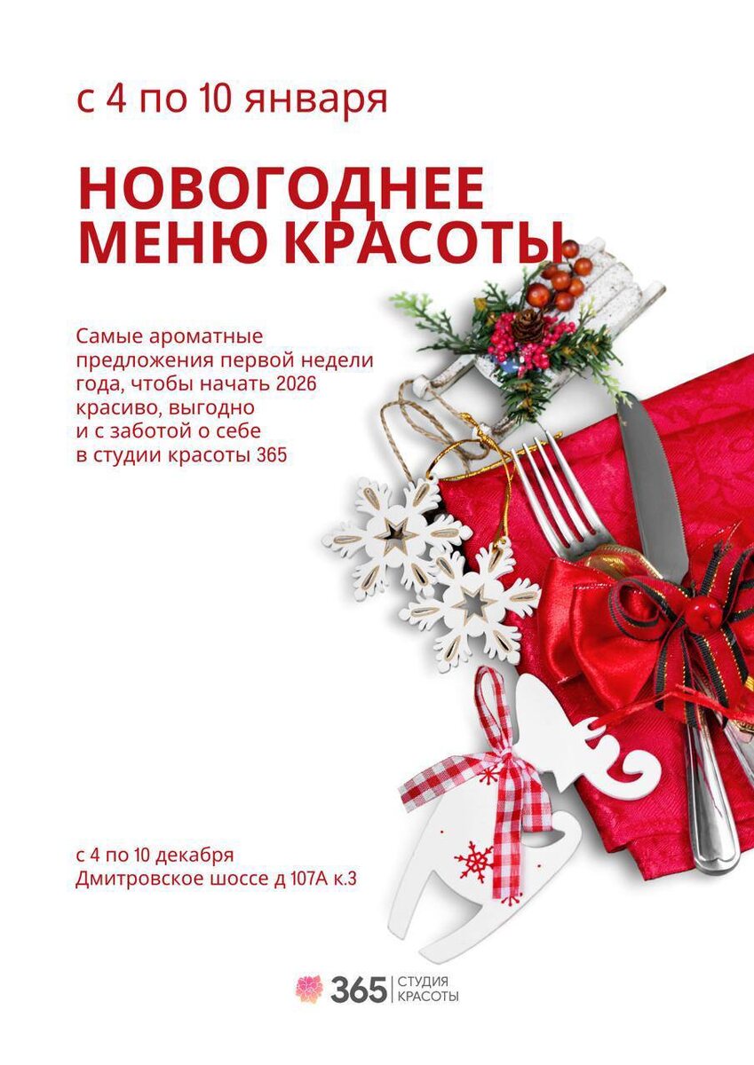 ✨ с 4 по 10 января Самые тёплые, ароматные и выгодные предложения первой недели года — чтобы начать 2026 красиво, спокойно и с заботой о себе 🤍 🔥ГОРЯЧЕЕ. ОСНОВНЫЕ БЛЮДА «Сибирская ёлка» Сложное окрашивание Мелирование / шатуш / балаяж / омбре / колорирование 🎁 Стрижка в подарок — для идеальной формы и завершённого образа. Как скульптор создаёт форму, так наш мастер создаёт ваш оттенок и силуэт. «Бефстроганов» Женская или мужская стрижка любой сложности 🎁 Уход NIRVEL с термошапкой в подарок — для здоровья и послушности волос. Чистая геометрия и ухоженные волосы — тренд вне времени. «Красная икра» Однотонное окрашивание 🎁 Уход NIRVEL с термошапкой в подарок — для глубины цвета и шелковистости. Цвет ложится ровно и сияет, как новогодний шар ✨ 🍽 КОМБО-ОБЕДЫ. СЫТНО И ВЫГОДНО Комбо «Икра на бородинском» Стрижка + любое окрашивание 🎁 Выгода 20% на всю сумму Классика полного преображения — по специальной цене. Комбо «Сельдь под шубой» Маникюр + педикюр с покрытием гель-лаком 🎁