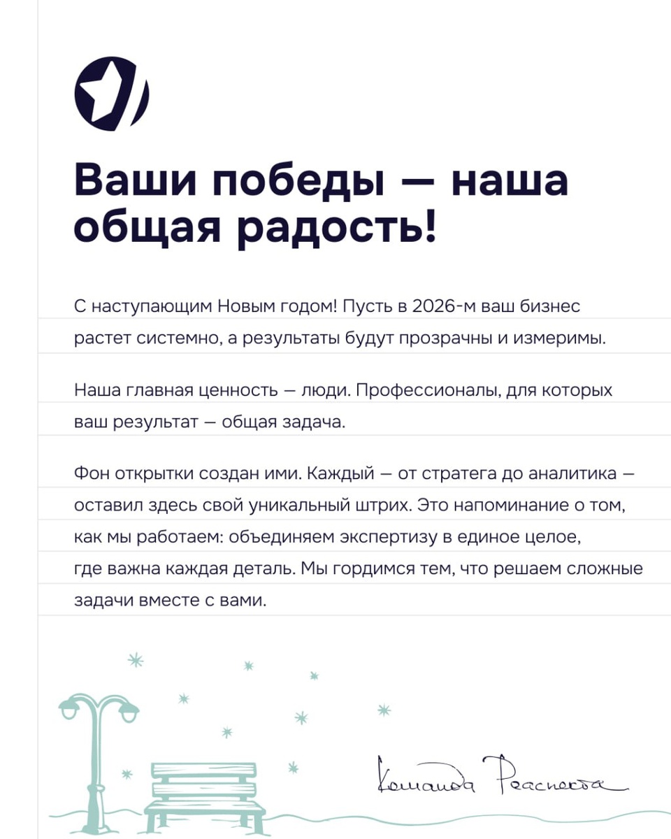 ! ⭐️ Пусть 2026-й станет годом системного роста, а бизнес-результаты будут прозрачными и измеримыми. Мы гордимся тем, что решаем сложные задачи вместе с вами, объединяя экспертизу и внимание к каждой детали. С наступающим Новым годом! ⭐️ Команда Реаспекта