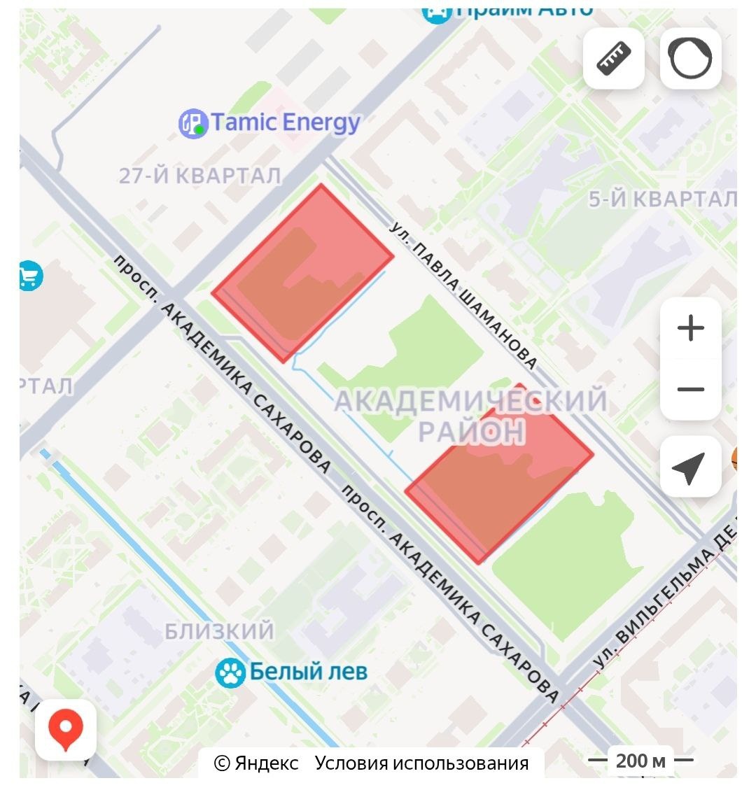 📍 Центральный «резервный» квартал Академического: Рябинина — Шаманова — де Геннина — пр. Академика Сахарова (5,4 га из 10+ га).
