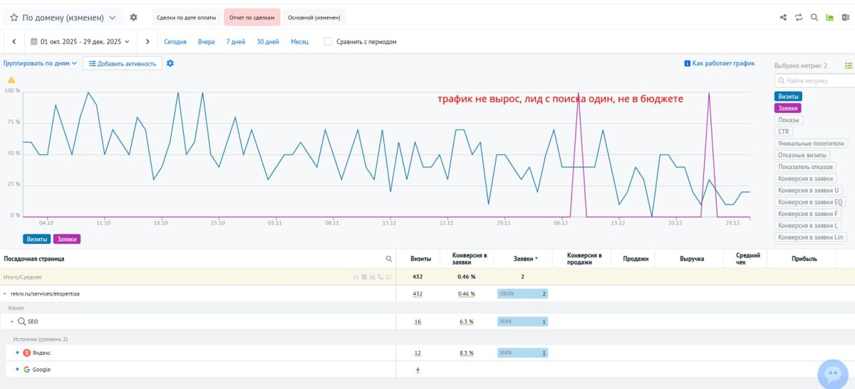 ну как видим по Роистат, роста трафика нет, заявка была только одна и та отпала потребность
