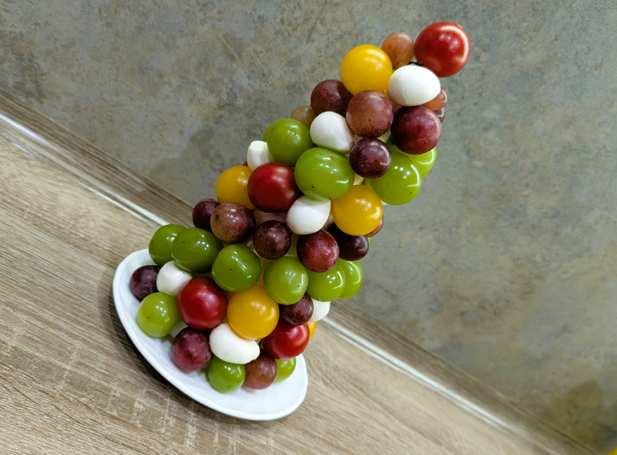 Съедобные ёлки — это самый вкусный тренд этого сезона. Они превращают обычные закуски и десерты в волшебное украшение, дарят гостям детский восторг и становятся центром праздничной фотозоны. Это больше, чем просто рецепты — это настоящее кулинарное волшебство, доступное каждому. От изящных канапе на шпажках до роскошных многоярусных фруктовых ёлок — эти идеи перевернут ваше представление о праздничной сервировке. Эта съедобная ёлка — не просто закуска, а настоящий edible-декор для вашего стола. Она сочетает в себе эстетику, свежесть и удобство: сочные шарики моцареллы, сладкий виноград и яркие томаты черри, нанизанные на шпажки и собранные в идеально ровную ёлку. Благодаря пенопластовому конусу-основе конструкция получается устойчивой, эффектной и её можно подготовить заранее. Это блюдо-трансформер: оно украсит фуршет, станет центром праздничной фотозоны и мгновенно исчезнет с тарелок гостей! Для их приготовления вам понадобится сыр, колбаса, огурец, оливки, маслины, зелень, болгарс