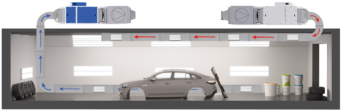 Установка качественной вентиляции в автомобильной покрасочной камере — одно из ключевых требований для эффективной и безопасной покраски автомобилей. Правильная организация вентиляции влияет на качество лакокрасочного покрытия, здоровье персонала и пожарную безопасность. Рассмотрим основные этапы установки вентиляции в автомобильную покрасочную камеру. Требования к вентиляции в авто покрасочных камерах: Создание ламинарного воздушного потока: В покрасочной камере должна обеспечиваться равномерная направленная подача чистого воздуха сверху вниз, создавая так называемый ламинарный воздушный поток. Такой режим гарантирует удаление пыли и загрязнений из рабочей зоны, предотвращая оседание частиц краски на окрашиваемой поверхности. Удаление токсичных паров растворителей: Важнейший аспект вентиляции — эффективное удаление испарившихся компонентов красок и лаков, содержащих вредные вещества (растворители, пигменты, смолы). Вытяжная система должна обеспечивать достаточный объем воздуха для п