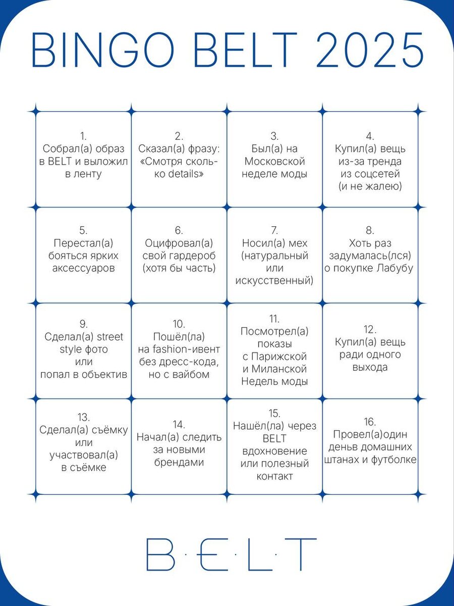 ! Готовы проверить насколько трендовым был ваш 2025й? В нашем Бинго BELT — 16 ярких моментов года: от модных экспериментов до спонтанных решений. Закрашивайте ячейки, собирайте комбинации иделитесь результатами в комментариях! Ктособерёт «бинго» первым? ✨👇🏼