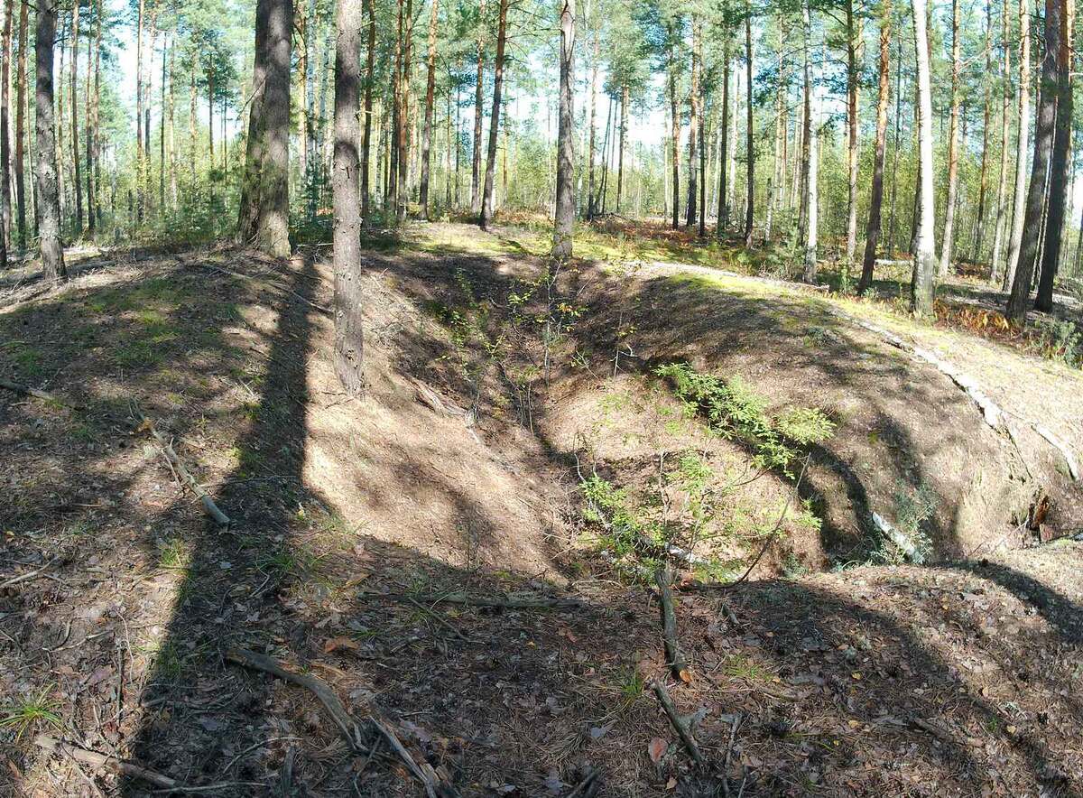 В тот день, когда двигался по лесу с фотоаппаратурой к обнаруженному в лесу Капищу, прилегающий лес удивил еще двумя увлекательными фактами. Первый факт к аномальщине не имеет отношение, но возможно интересно – это наша непридуманная История. Во время одной из остановок на машине, встретил местного жителя, который показал расположенные совсем не далеко окопы и блиндажи времен Великой Отечественной войны. А ведь это место находится в 170 километрах восточнее Москвы, бои в этих местах не проходили. И вдруг здесь обнаруживается целая сеть окопов и блиндажей, причем первая линия, вторая, и так далее. По-другому, как «глубоко эшелонированная оборона», эти укрепления назвать нельзя. Направление окопов строго на запад - в строну Москвы. В полутора километрах перед окопами расположено труднопроходимое болото. Сами укрепления находятся на взгорке. Все укладывается в тактику ведения боя. Напрашивается вопрос – в 1941 году всерьез готовились к сдаче Москвы фашистам? Хотя чему удивляться, если