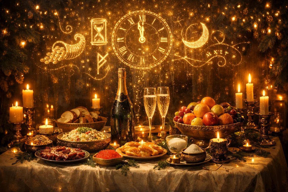 Новогодний стол — это не просто традиция, а зашифрованный обряд, прошедший через века. Даже не осознавая этого, люди каждый год повторяют один и тот же сценарий: выкладывают символы изобилия, запускают новый цикл и закрепляют намерение жить лучше, чем в прошлом году.