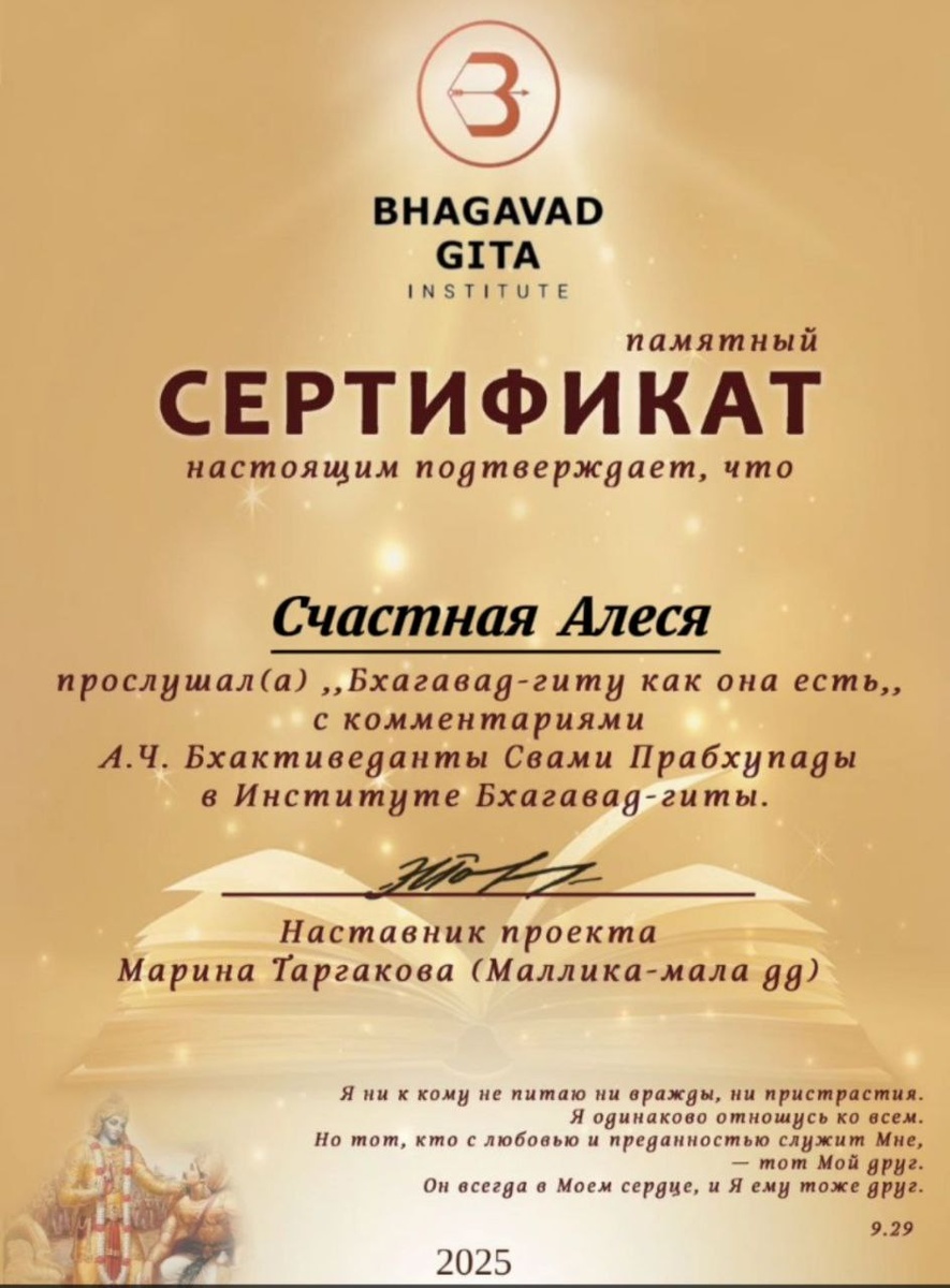 До обучения в Институте Бхагавад-гиты я проходила курс астрологии «Варшапхал» - это раздел ведической астрологии, который используется для составления годового прогноза. В ходе анализа моей годичной карты, выяснилось, что на 2025 год планеты образовали комбинацию под названием «человек в ладошках Бога». Я еще очень удивилась, и подумала, что, наверное, Бог окажет какое-то расположение ко мне, и мне было очень интересно, как это соединение планет отыграется именно в моей жизни.