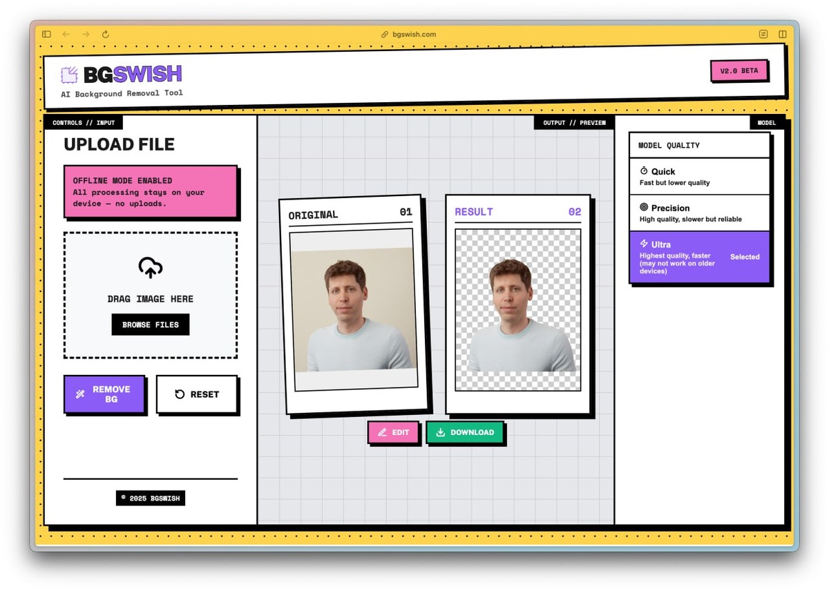 ! 💡 Нашли крутой инструмент для удаления фона с фото. Он работает полностью на вашем компьютере. 🔒 Ваши файлы не отправляются в облако. Просто скачайте нужную модель. ✅ Инструмент находится тут: https://bgswish.com/ #ИИ #УдалениеФона #ИнструментыДляФото #БезопасностьДанных #МашинноеОбучение #Технологии #Сервисы ✨ Узнал что-то новое? 🚀 Подписывайся, чтобы не пропустить!