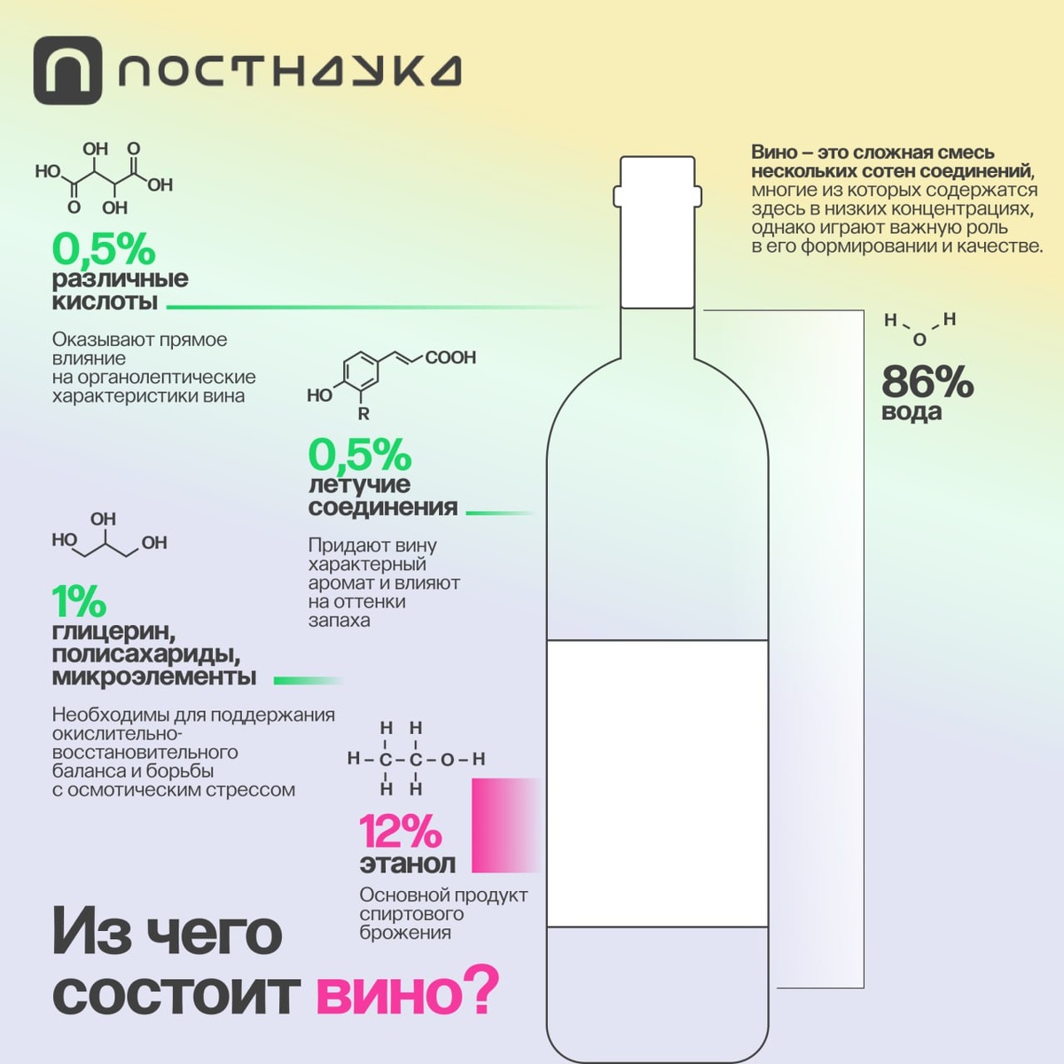 В процессе брожения дрожжи утилизируют сахар из виноградного сока, превращая его в этанол и углекислый газ. В конечном итоге вино представляет собой сложную смесь из нескольких сотен различных молекул. Сколько выпитых бокалов потенциально не вредят здоровью: https://postnauka.org/wtf/156969