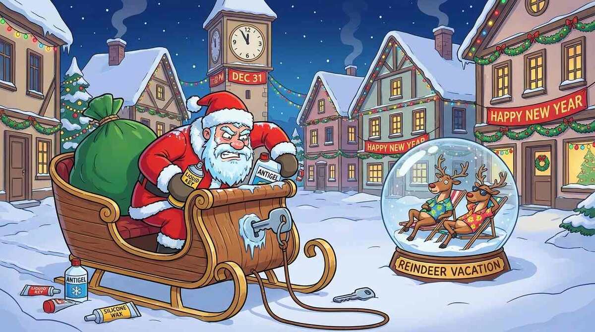 Знакомая ситуация? Только у вас это не сани, а ваша машина утром 1 января. Замёрзшие замки, мёртвый аккумулятор, дизель превратился в желе — всё это можно предотвратить. Разбираемся, как пережить зимние праздники без автомобильных драм.