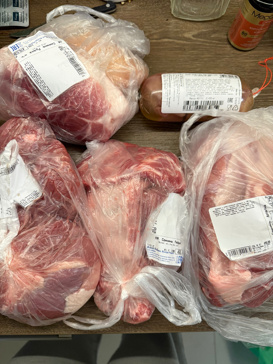 - окорок: поджарка получилась идеальная: тонкие прослойки сала и мякоть; кусок оставила для запекания, небольшой кусочек - на суп. По 360 р/кг