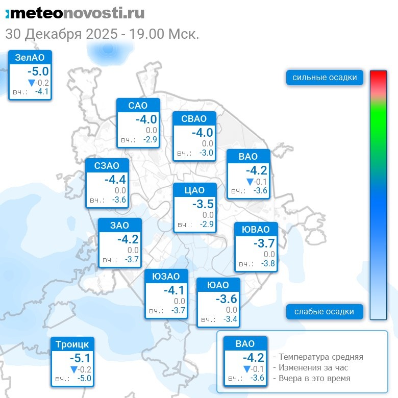 В 19:00 в Москве было от -5.4°C до -3.1°C, средняя температура -4°C #погода #Москва #зима #температура #30декабря #вторник