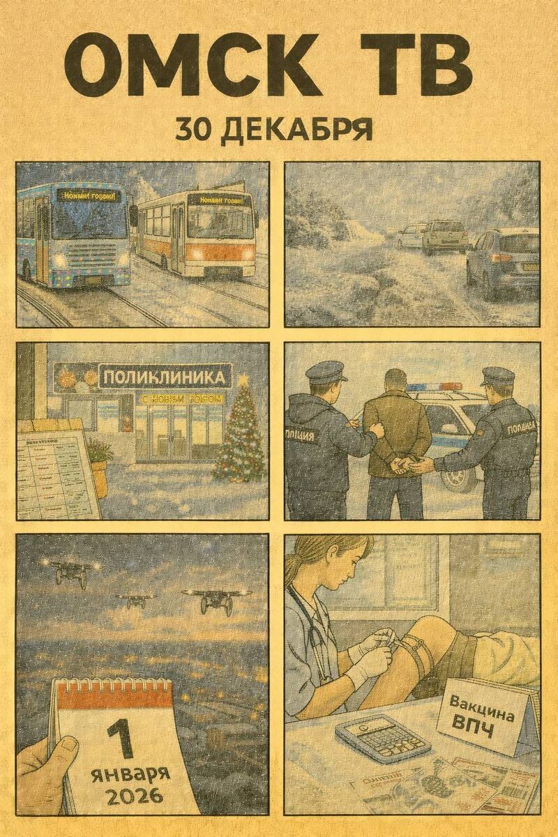 : ▪️Общественный транспорт Омска переходит на праздничный режим. ▪️В Омской области ухудшилась погода. ▪️Как будут работать омские поликлиники в новогодние праздники: подробный график. ▪️Омич задержан за участие в афере на 23 млн рублей. ▪️В небе над пригородом Омска появятся дроны - и это нормально. ▪️ВПЧ-вакцинация может стать бесплатной по всей России с 2027 года. ▪️Новогоднее небо готовит сюрпризы: редкие и красивые явления.
