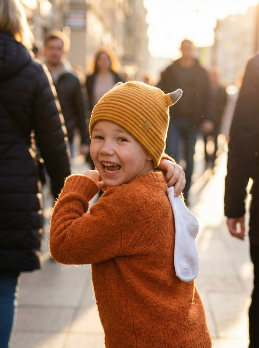 🔠🔠🔠🔠🔠🔠🔠⭐️ Промт из серии "Корпорация монстров" 4/9 Промт адоптирован для мальчика 5 лет, меняем цифру на нужную и меняем BOY на GIRL 👉Генерирую тут A hilarious, candid snapshot of a 5-year-old boy twisting his body in a circle on a busy city sidewalk, frantically trying to reach a white sock pinned to the back of his fluffy orange wool sweater. He wears a striped yellow-orange beanie with a small horn. His expression is one of playful panic and confusion. Passersby are blurred in the background (bokeh). Golden hour backlighting, genuine emotion, street photography style, highly textured orange fur. --ar 3:4 Заказать промт или фотосессию. ✉️ Буст канала. ⚡️ #нейросеть #aiфотосессия #промтыдляфотографа