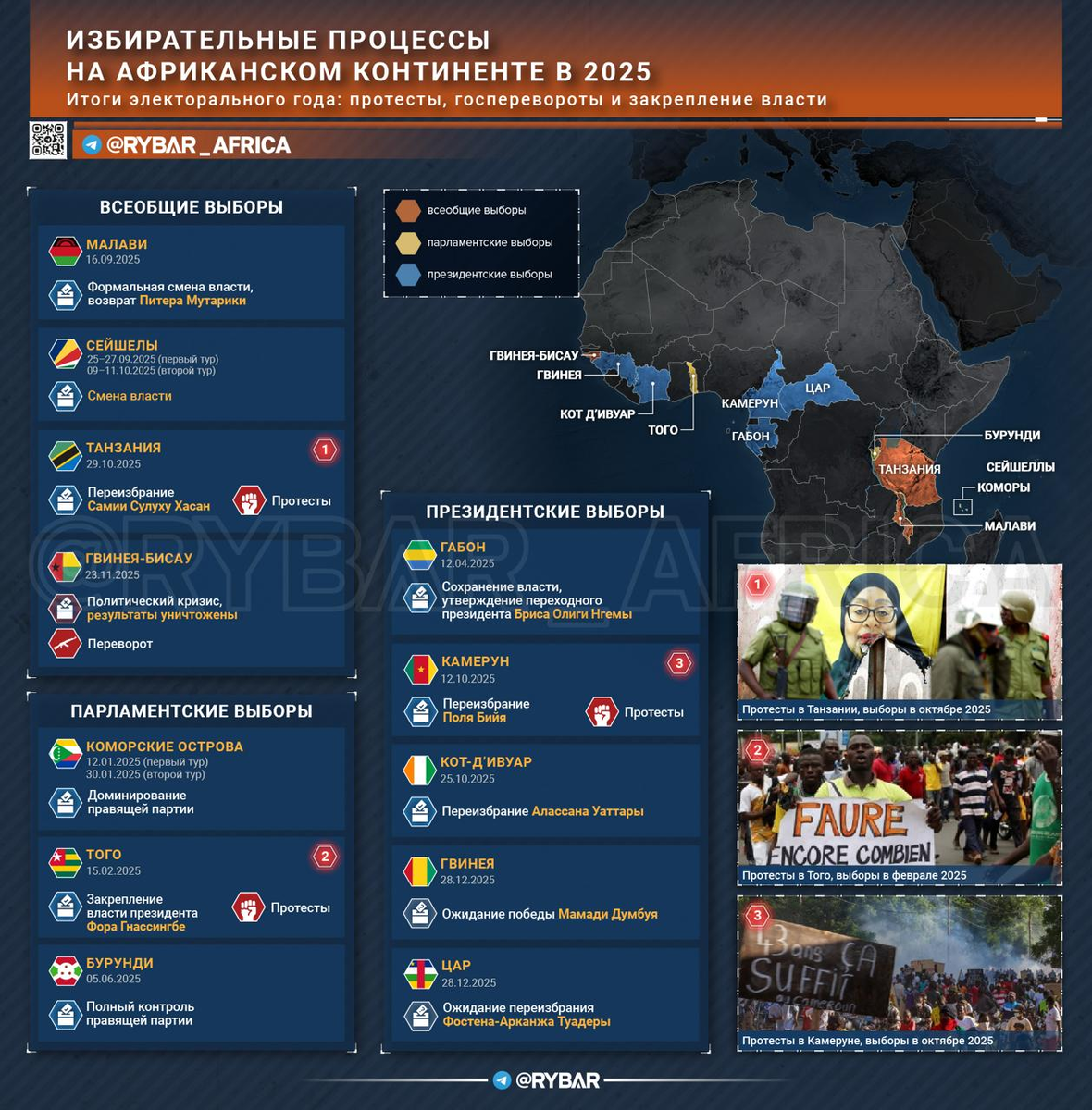 Выборы на континенте в 2025 году прошли без особых сюрпризов: почти везде, где были голосования, действующие руководители или правящие партии сохранили власть: через переизбрания, конституционные реформы или исключения оппозиции. В такой картине особенно бросались в глаза редкие случаи вроде Сейшел, где смена верхушки всё же произошла. 🔻Как прошли выборы: 🔸Габон, Танзания, Кот-д’Ивуар, Камерун, Коморы, Бурунди — здесь результаты оказались предсказуемыми. Переизбрание лидеров, отсутствие серьёзных конкурентов и высокий уровень контроля над избирательным процессом стали общей нормой. 🔸Малави выбилась из тренда: избиратели отреагировали на экономический кризис и вернули к власти Питера Мутхарику. 🔸Сейшелы — ещё один контрапункт. Оппозиция выиграла и президентские выборы, и выборы в парламент, обеспечив редкий пример мирной ротации власти. 🔸В Гвинее-Бисау избирательная кампания завершилась (https://t.me/rybar_africa/1261)силовым сценарием: спор о результатах перерос в очередной военн