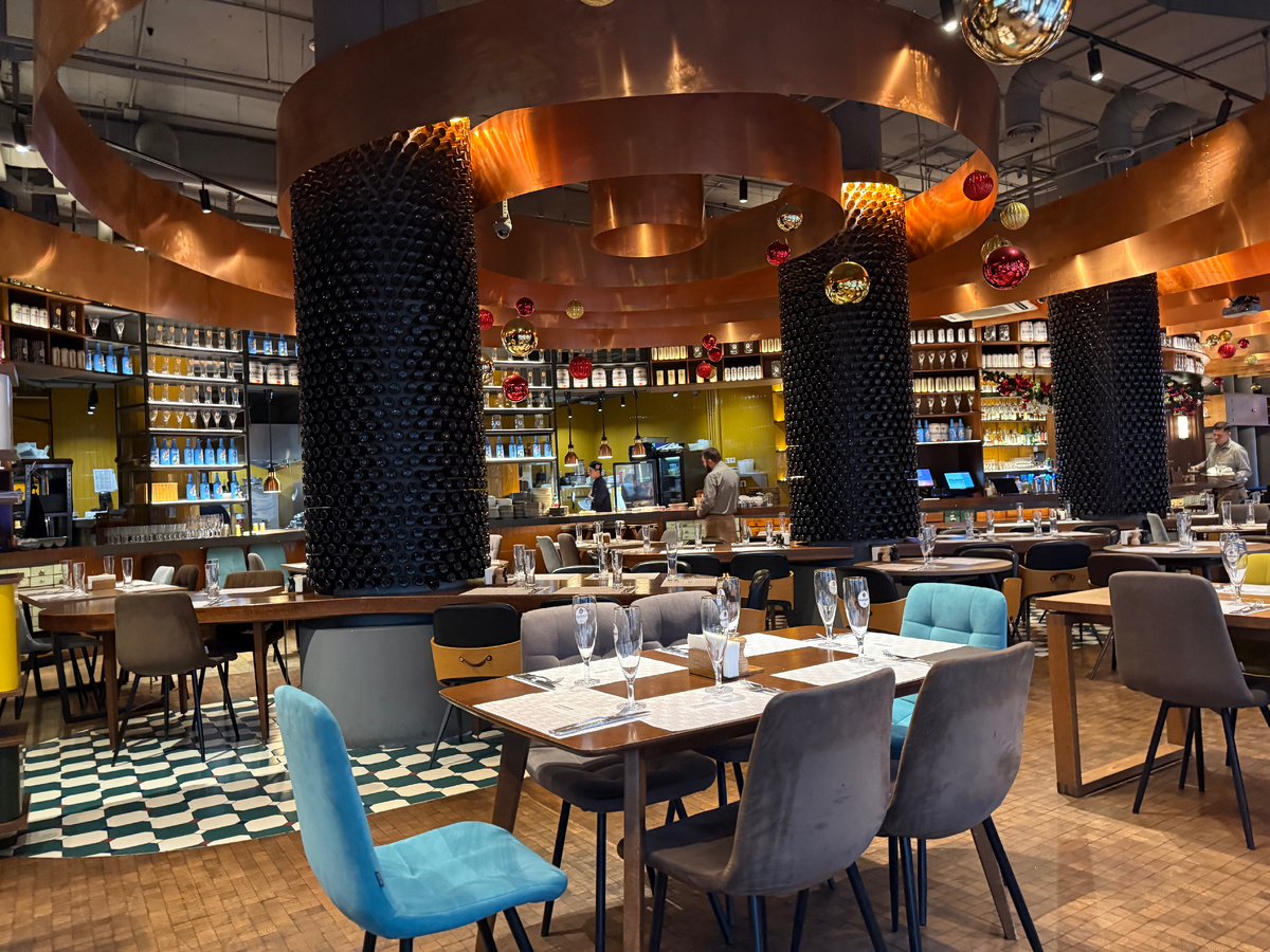 Огромные окна в пол, за ними Тверская. Большие удобные столы. Бутылки, воткнутые в колонны. Расторопные официанты. Красочные насыщенные меню.