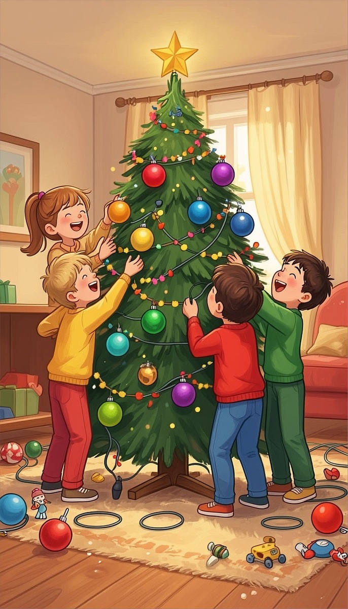 Дети: Оставленные дома одни, решают украсить ёлку. Результат напоминает взрыв фейерверков внутри помещения. Шары повсюду, гирлянды запутались, а звезда оказалась на полу.