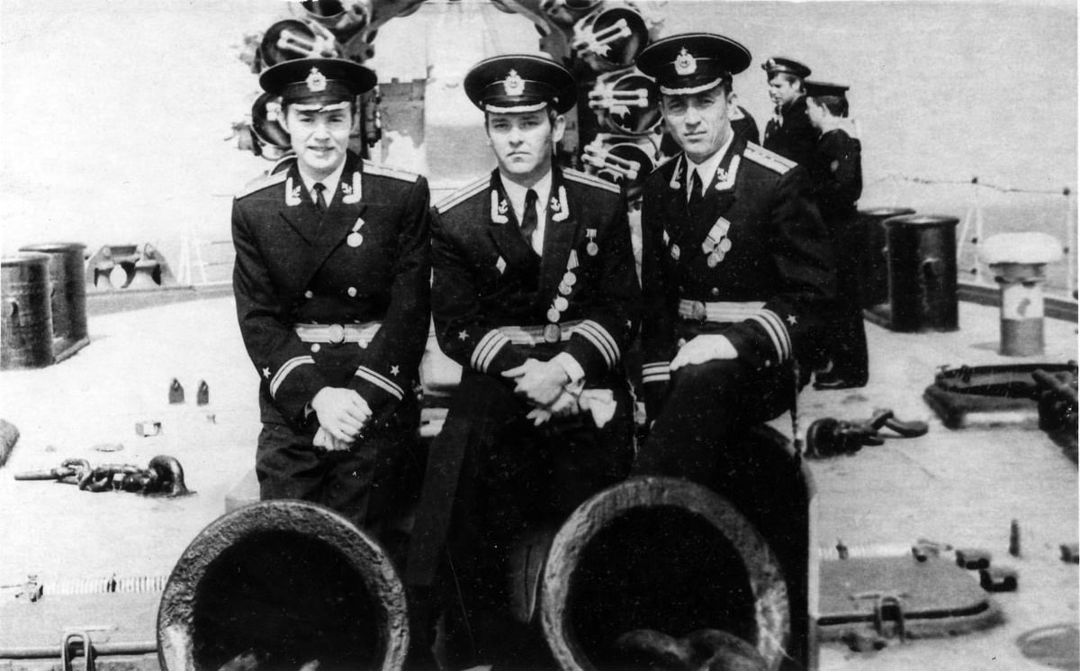 И. (слева) со своими сослуживцами на палубе ПКР "Москва". Противолодочный крейсер «Москва», головной корабль проекта 1123, спроектированный Невским проектно-конструкторским бюро. Экипаж крейсера — войсковая часть 26951. Источник: отсканированная фотография из личной коллекции. #фото #ВМФ #Черноморский_флот #ЧФ