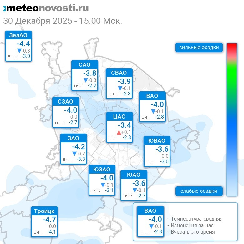 В 15:00 в Москве было от -4.9°C до -3.1°C, средняя температура -3.9°C #погода #Москва #зима #температура #30декабря #вторник