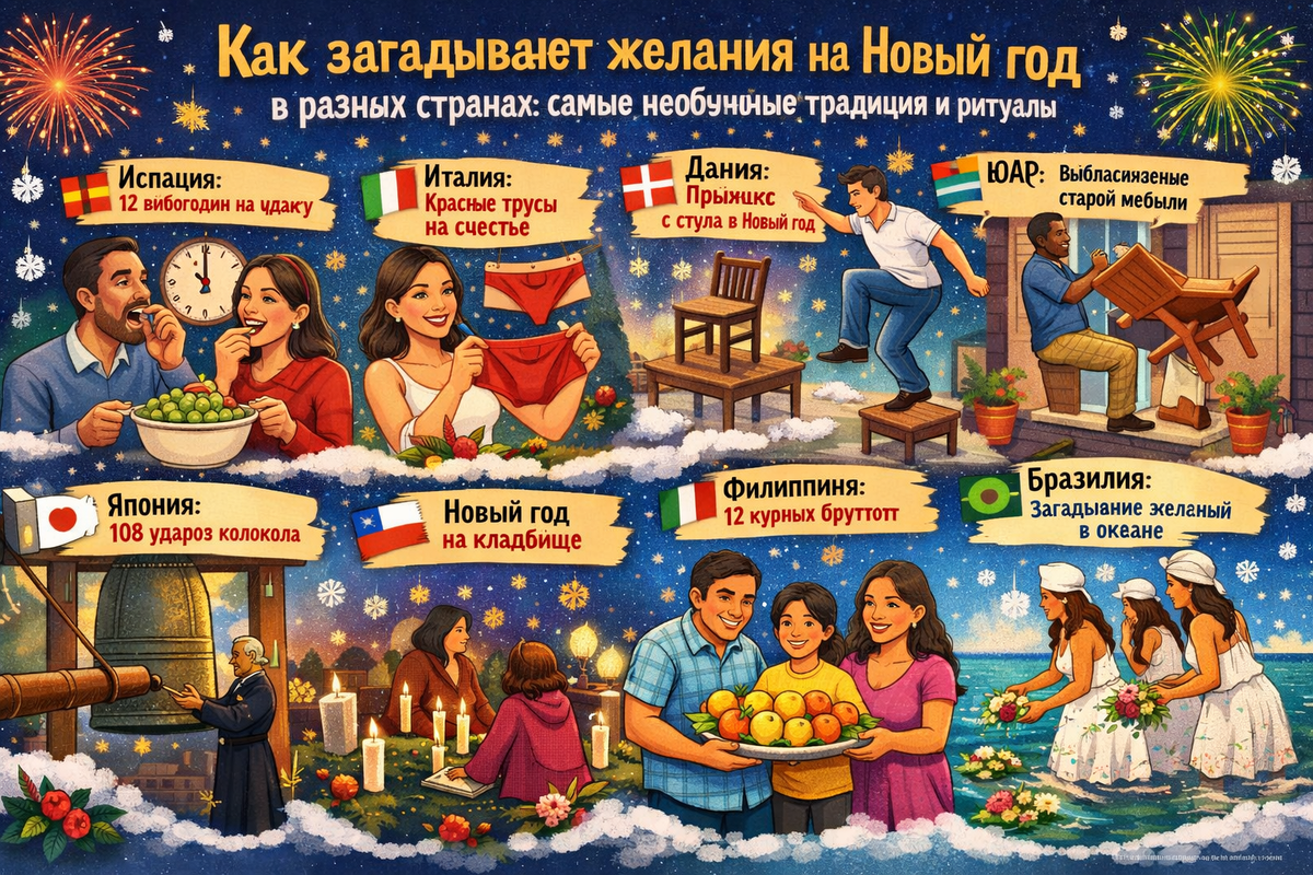 И вот что интересно: желания в эту ночь загадывают не одинаково. Кто-то ест виноград, кто-то прячет цвет под одеждой, а кто-то выбрасывает воду из окна так решительно, будто смывает все сомнения вместе с прошлым. Я собрала самые яркие традиции — и получился маленький путеводитель по человеческой надежде.