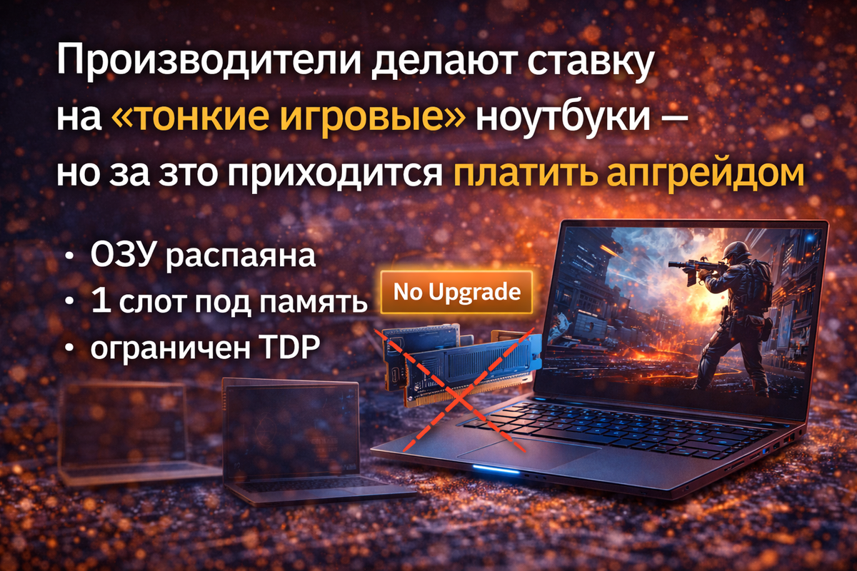 Работаем с ноутбуками каждый день: подбираем, тестируем, разбираем конфигурации и общаемся с реальными покупателями. Поэтому смотрим на рынок не через красивые рендеры, а через то, с какими ограничениями люди сталкиваются спустя год-два использования. Современный thin gaming — это: Но чтобы уместить всё это в тонкий корпус, производителям приходится идти на компромиссы. Один из самых частых шагов — полностью распаянная ОЗУ. Это позволяет: Но для пользователя это означает: Даже если память не распаяна полностью, всё чаще встречается: Для игровых ноутбуков, которые покупают не на год, это критично. Тонкий корпус = меньше ох