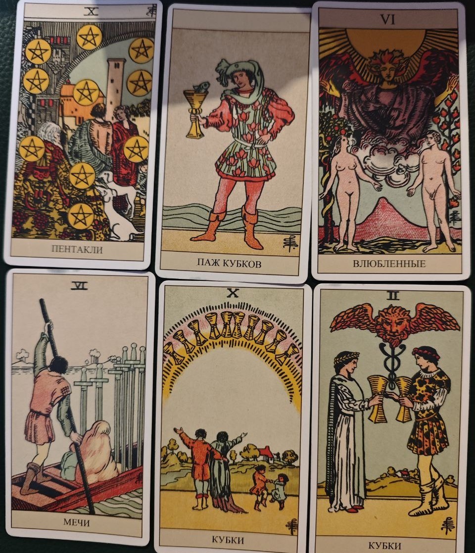Карты: пентакли 10, паж кубков, влюблённые, мечи 6, кубки 10, кубки 2