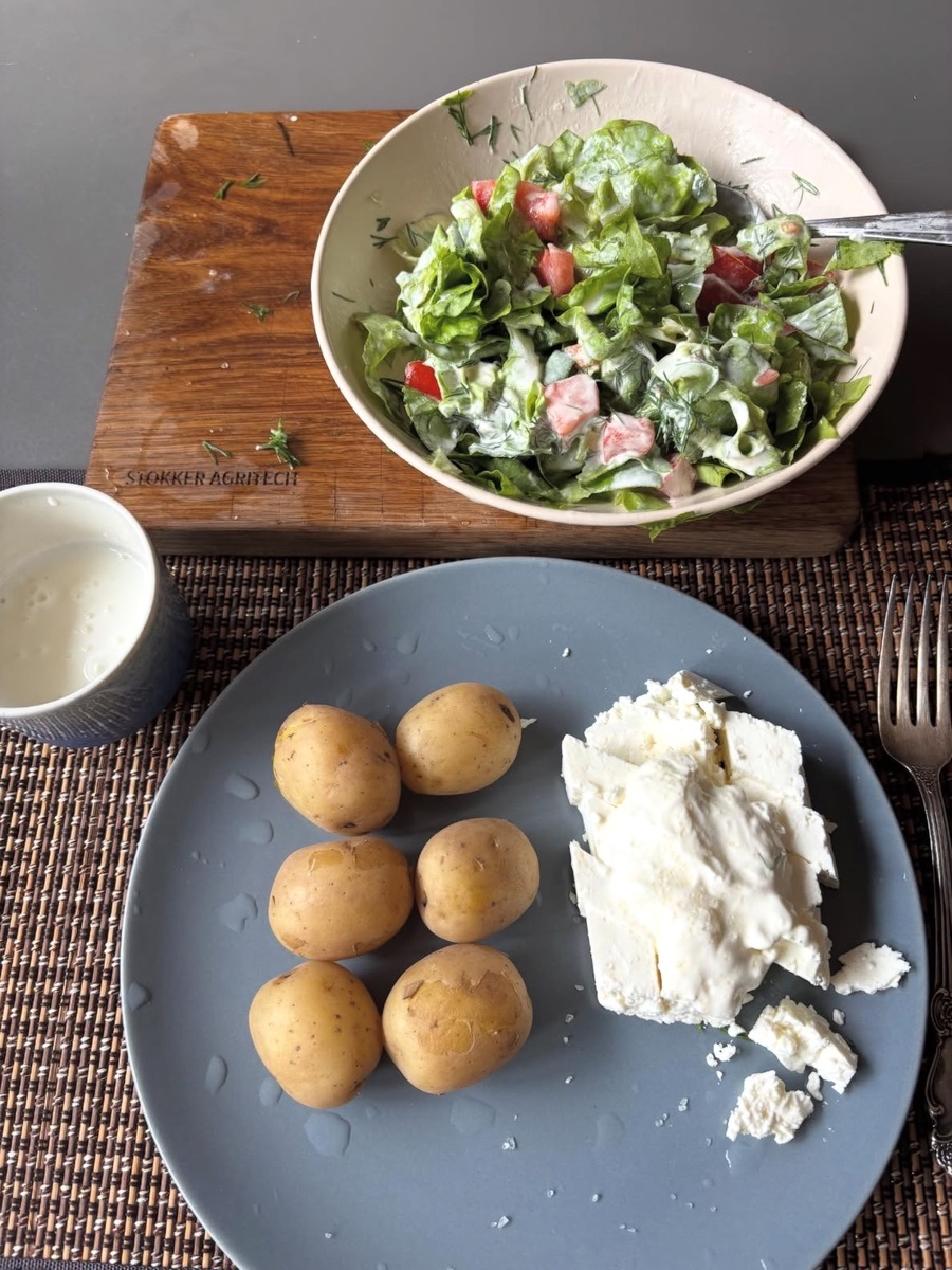 - Салат с творогом и картошкой — идеальный пример сбалансированного сочетания. Клетчатка из овощей, белок и жир из творога со сметаной создают «буфер», который смягчает гликемический ответ от картофеля.