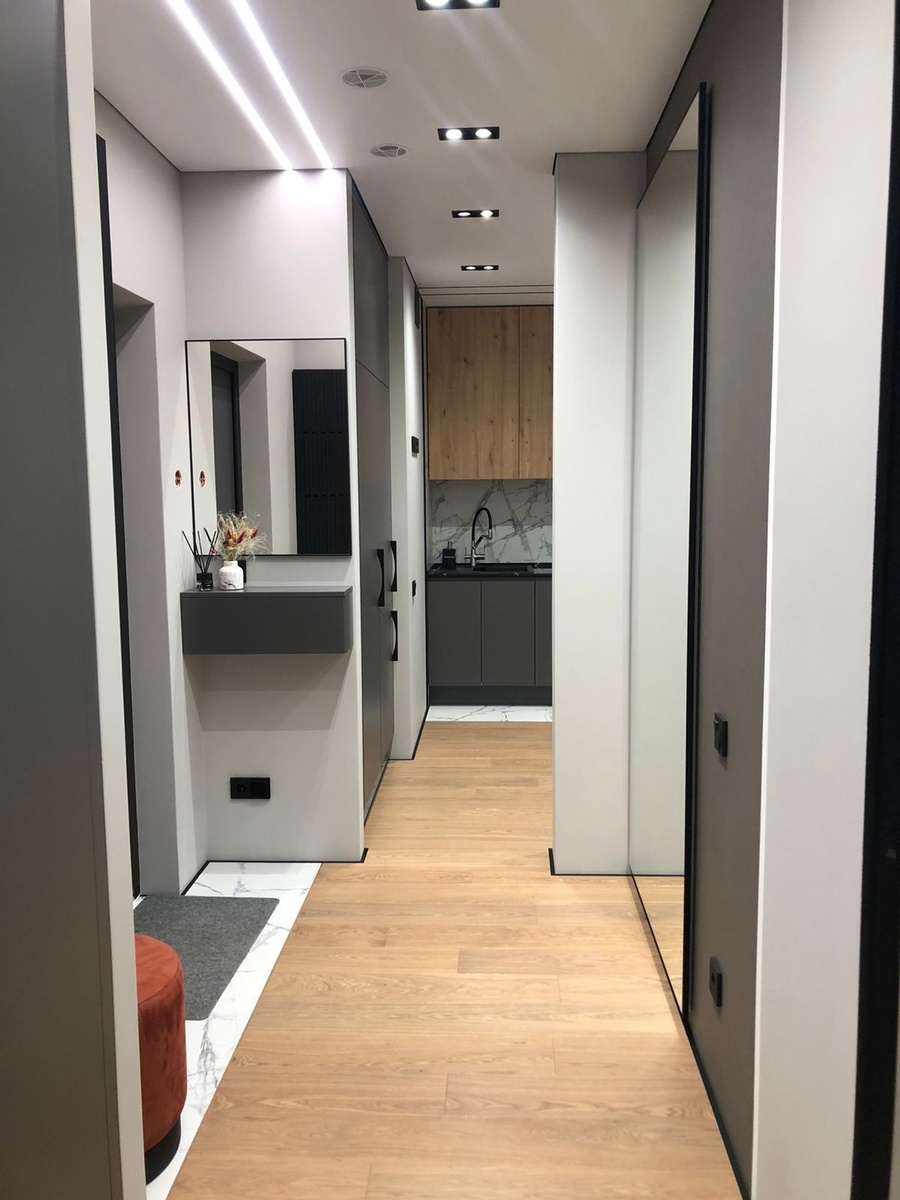 «Я получил именно то, что хотел — стильное пространство, где каждая деталь на своем месте. Особенно радует зеркало с подсветкой на кухне и бесшовный переход между плиткой и ламинатом.» Монохромный ремонт — это всегда вызов, требующий идеального исполнения. Но именно он позволяет создать по-настоящему с
