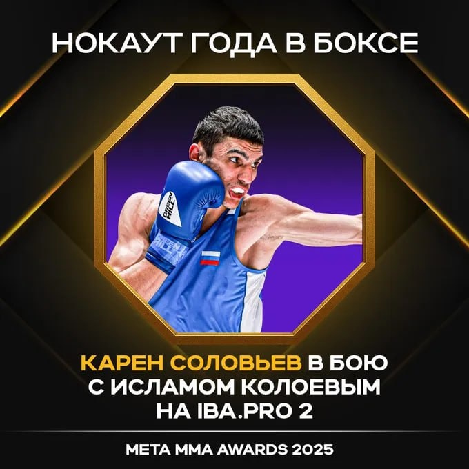 Meta MMA Awards 2025 определили самый эффектный финиш года в ринге — победа Карена Соловьёва над Исламом Колоевым набрала 38 баллов и заняла первое место в номинации.