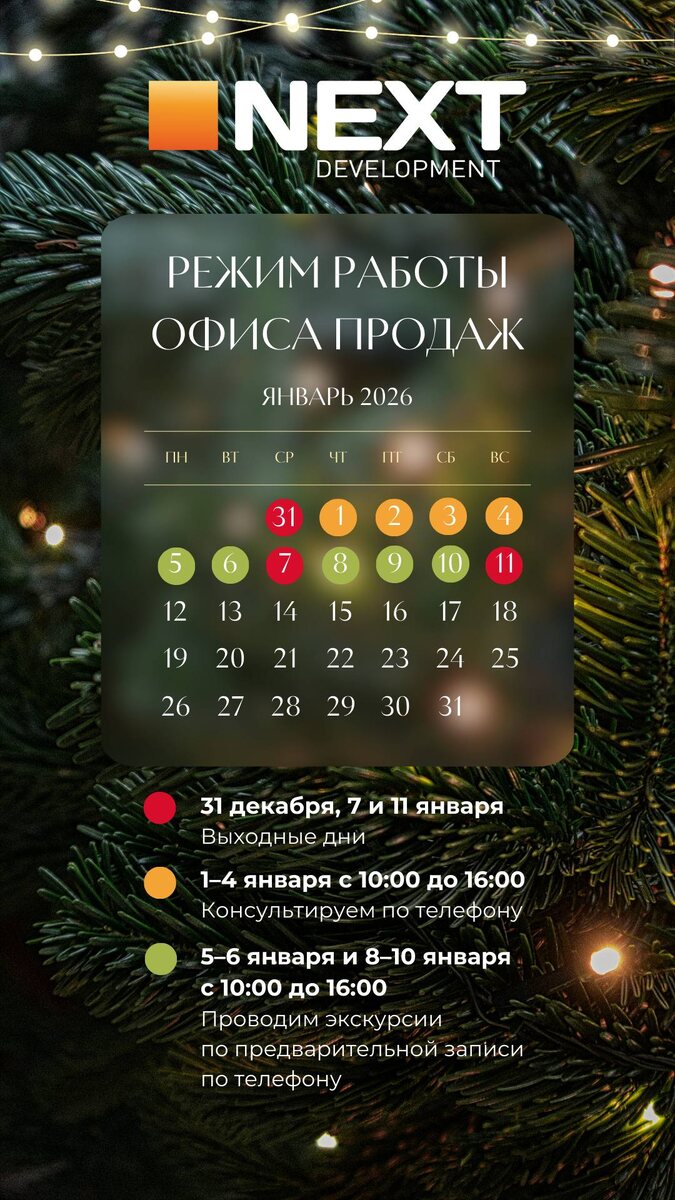 ! Поздравляем вас с наступающим Новым годом и Рождеством! 🎄 Пусть этот год начнётся с тёплых решений и приятных перемен. ✨ Ждём вас на новогодних каникулах — в волшебной атмосфере самое время выбрать квартиру мечты! В праздничные дни компания NEXT Development работает по следующему графику: • 31 декабря, 7 и 11 января — выходные дни; • 1–4 января — с 10:00 до 16:00 работаем в режиме консультаций по телефону; • 5–6 января, 8–10 января — с 10:00 до 16:00 проводим экскурсии на объекты по предварительной записи. 📞 Запись на экскурсию: 36-22-06