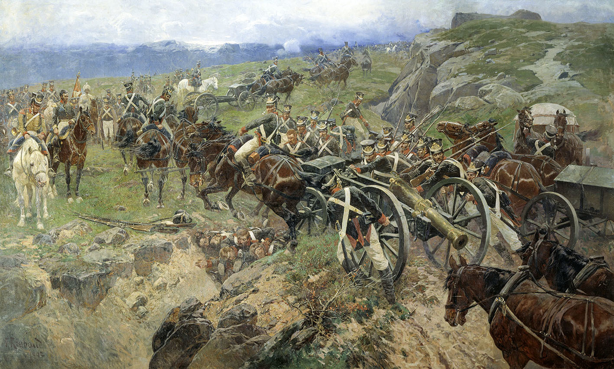 Одним из самых впечатляющих полотен русской батальной живописи стала картина "Живой мост" Франца Рубо, написанная в 1897 году. Эта история произошла летом 1805 года в Нагорном Карабахе, только что покорённом Россией азербайджанском ханстве, которое персы вознамерились вернуть. Гонцы сообщили шаху, что белый царь ввязался в большую войну на западе и большая часть его войск покинула Кавказ, и вскоре после таких известий Аракс перешла 20-тысячная армия принца Аббас-Мирзы. Недооценив масштаб проблемы, генерал Павел Цицианов (сам, кстати, грузин) послал из Гянджи на помощь майору Дмитрию Лисаневичу в Шуше егерский отряд под началом полковника Павла Карягина... всего 493 человека при 2 орудиях. То был самый настоящий Русский Анабазис - в окружении 50-кратно превосходящих сил карягинцы маневрировали по чужим горам три недели, давая успешные сражения, и хотя отряд сточился в итоге примерно до ста человек, они смогли дождаться подхода основных сил Цицианова. Конечно же, такие вещи делаются не