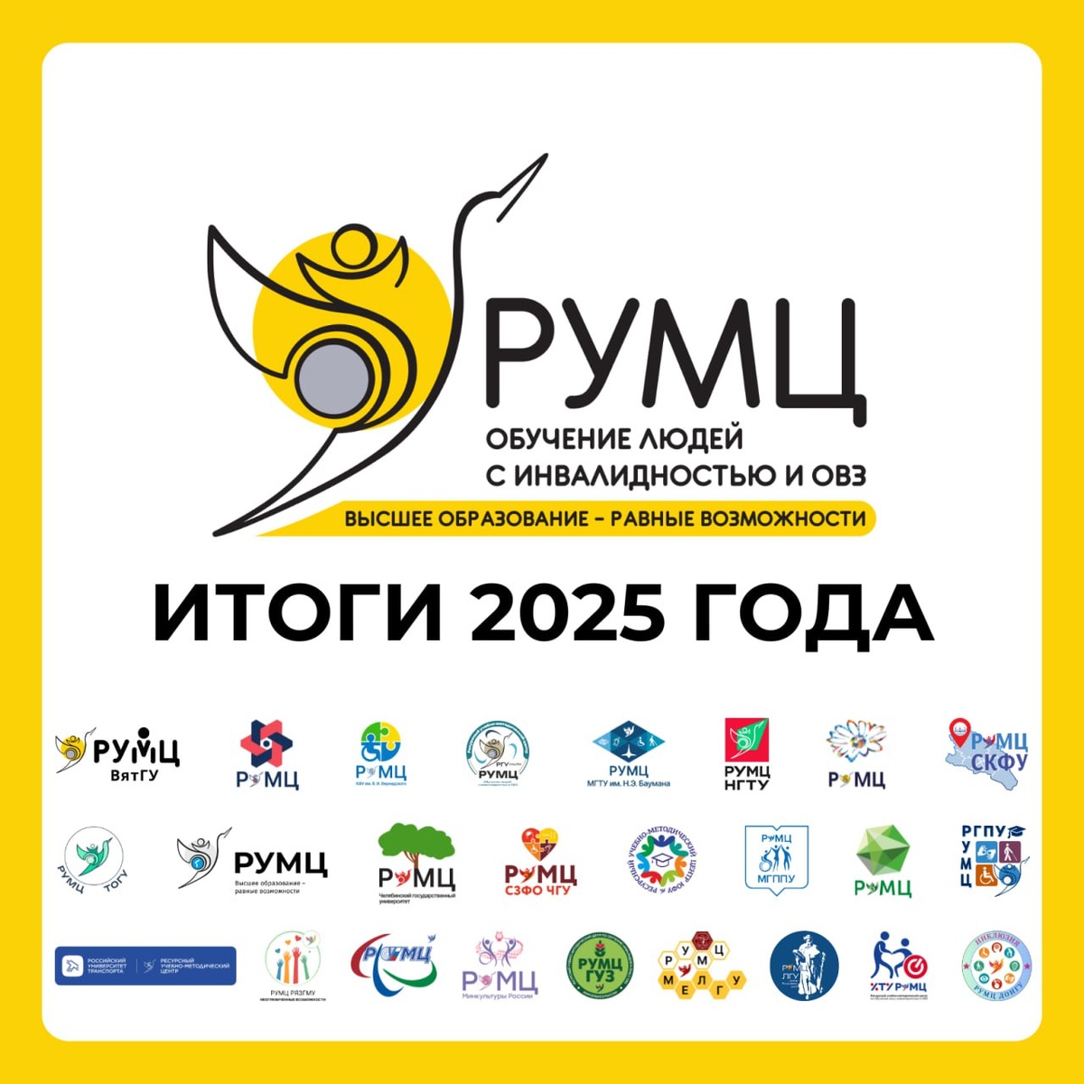 Уже завтра мы проводим 2025 год. Он стал для нас всех важным и наполненным смыслом. Спасибо каждому из вас за вклад, за ответственность и то тепло, которое мы сохраняем в нашей команде. Давайте с благодарностью вспомним ключевые события и достижения 2025 года, которые сделали нас сильнее и ближе. 🚩 Впервые в этом году сетью РУМЦ организованы: - Инклюзивный киноклуб «(Не)такой как все» — на базе ТюмГУ. - Стратегическая сессия Молодежного инклюзивного сообщества — на площадке ГУУ. - Всероссийская конференция «Экономическая модель инклюзивного образования» в ЮФУ. Также впервые во Всероссийском конкурсе «ИнваПрофи» приняли участие специалисты высшей школы в номинациях «Педагог-предметник» и «Социально-педагогические и социально-психологические практики». 💠 Успешно состоялись традиционные мероприятия сети: - IV Общероссийская студенческая смена по инклюзивному волонтёрству и туризму в ТОГУ. - II Всероссийский фестиваль инклюзивной культуры и творчества в НГТУ. - III Спартакиада по адап