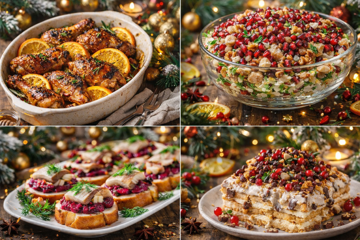Если вы читаете это с кружкой чая, глядя на пустой холодильник и думая «ну вот, опять», — вы не одни. Хорошая новость: вкусное новогоднее меню можно собрать за один вечер, без экзотических ингредиентов и многочасовой готовки. Ниже — четыре красочных, проверенных и праздничных рецепта, которые выглядят «вау», а готовятся легко. Яркий, свежий и нарядный — именно такой салат первым улетает со стола. Ингредиенты (на большую миску): Как готовить: 💡 Совет: выложите салат слоями в прозрачную миску — выглядит эффектно без лишних усилий. Запах этого блюда — половина новогоднего настроения. Ингредиенты: Как готовить: 🔥 Результат: золотистая корочка, сочное мясо и аромат, от которого гости заглядывают на кухню. Знакомый вкус — в современной и быстрой подаче. Ингредиенты: Как готовить: ✨ Плюс: не нужно собирать салат слоями — всё делается за 10 минут. 🍰 Десерт «Новогодний торт без выпечки» Когда хочется сладкого чуда, а времени — ноль. Ингредиенты: Как готовить: 🍓 Совет: добавьте меж