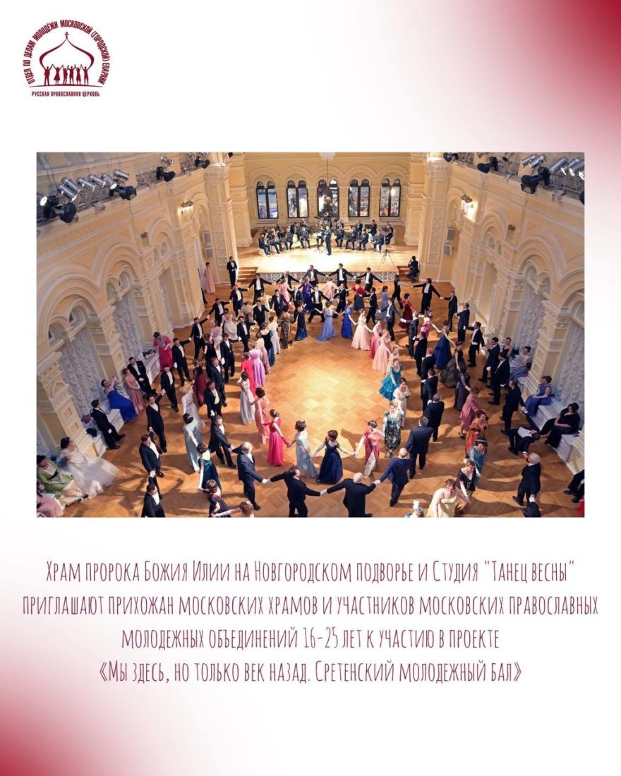 Храм пророка Божия Илии на Новгородском подворье (https://sprav.moseparh.ru/org/370) и студия «Танец весны» приглашают прихожан московских храмов и участников московских православных молодежных объединений 16-25 лет к участию в проекте «Мы здесь, но только век назад. Сретенский молодежный бал». Бал состоится в ГУМе 15 февраля 2026 года. Проект реализуется с 1 декабря 2025 года по 28 февраля 2026 года и включает в себя мастер-классы по историческим танцам, лекции по культуре первой трети XIX века, бальной культуре первой трети ХХ века, бальному этикету и семинары по бальному образу, а также экскурсию на выставку исторического костюма. Все мероприятия проекта бесплатные. Лекции, семинары и мастер-классы буду скомпонованы в блоки по 3 часа, за 1 день можно будет посетить несколько мероприятий. Планируется 4-6 блоков (дней). Приглашение на бал можно получить только лично после посещения одного из них. Родители и другие родственники на мероприятия проекта, включая бал, не допускаются. Для у