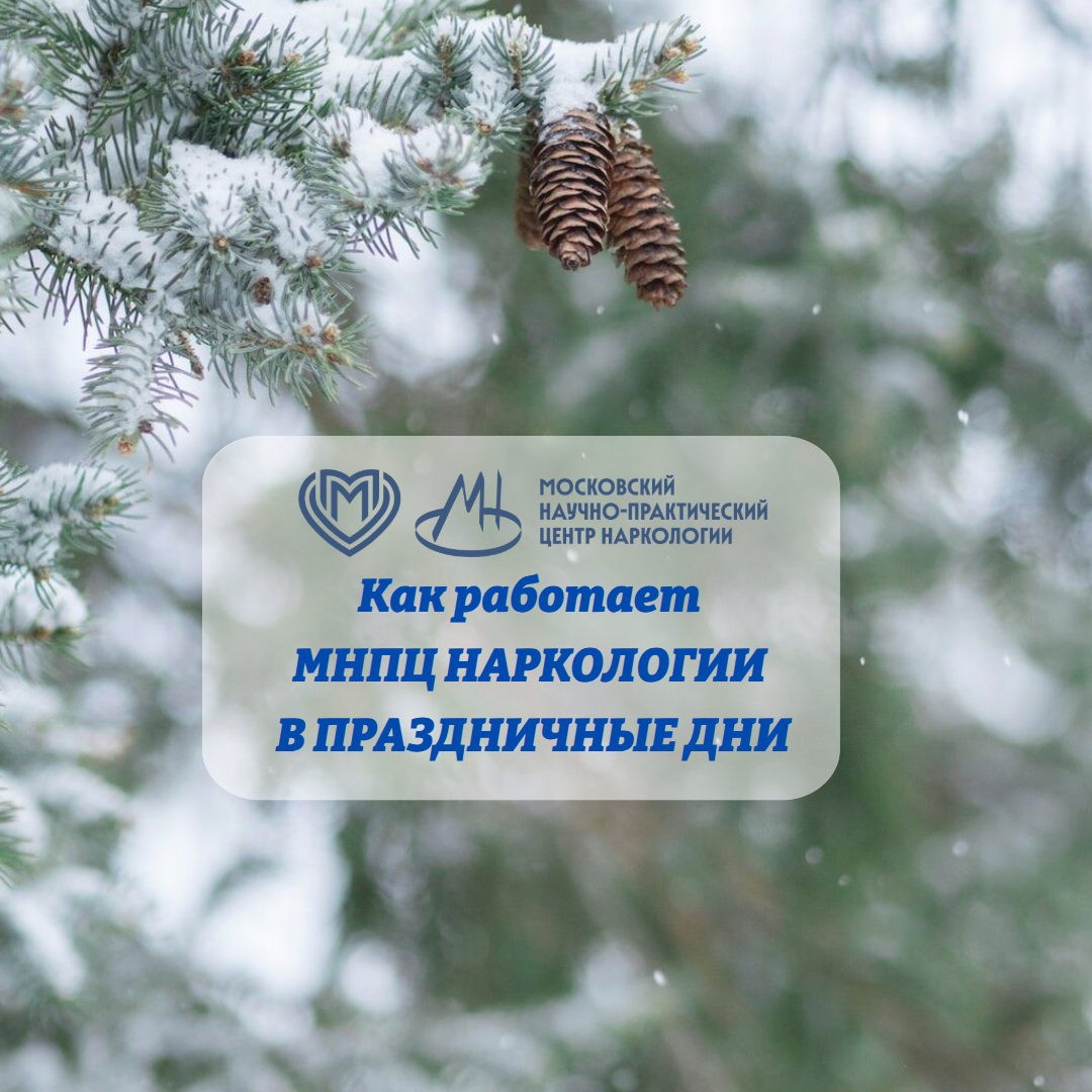 Уважаемые жители города Москвы, пациенты, родственники пациентов и посетители МНПЦ наркологии! Выкладываем график работы наркологических диспансеров МНПЦ наркологии ДЗМ в новогодние праздники: 31 декабря 2025г. – выходной день. 1,2 января 2026г. – выходные дни. 3 января 2026г. – с 09:00 до 15:00 4,5,6,7 января 2026г. – выходные дни. 8 января 2026г. – с 09:00 до 15:00 9,10 января 2026г. – выходные дни. Адреса и телефоны Наркологических диспансеров: ЦАО, НД№1: ул. Садовническая д. 73, стр.2, +7(495)951-83-87 САО, НД№2: ул. Куусинена д. 4, корп.3, +7(499)195-30-05 СВАО, НД№3: ул. Таймырская д. 8, корп.1, +7(495)474-77-01 ВАО, НД№4: ул. Щербаковская д. 57/20, +7(499)166-73-30 ЮВАО, НД№5: ул. Маршала Чуйкова д. 24, +7(499)178-31-94 ЮАО, НД№6: ул. 2-й Автозаводский пр. д. 4, стр.1, +7(495)675-24-46 ЮЗАО, НД№7: ул. Шверника д. 10А, стр.2, +7(499)126-25-01 ЗАО, НД№8: ул. Барклая д. 5, стр.6, +7(499)145-00-11 СЗАО, НД№9: ул. Мещерякова д. 4, корп.1, +7(495)491-66-82 ЗелАО, НД№10: Зеленоград, п