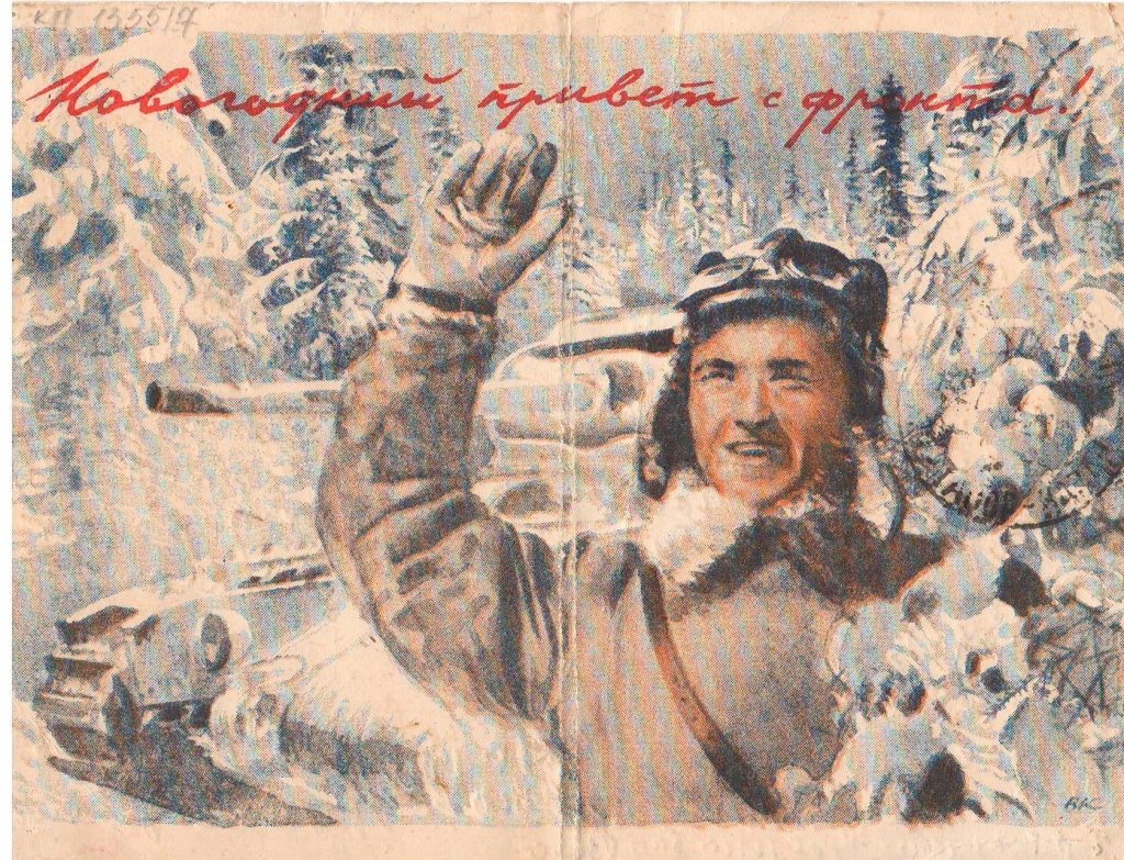 Приближается Новый год. Этот праздник всегда был символом мира, добра, благополучия. В годы Великой Отечественной войны советский народ мог об этом только мечтать. В новогоднюю ночь загадывалось одно на всех желание: чтобы поскорей закончилась война, а родные люди поскорее вернулись домой. Несмотря на то, что шла Великая Отечественная война, в Советском Союзе не прекратилось производство новогодних открыток. Первые новогодние открытки были выпущены к встрече 1942 года. На них был изображен эпизод военного парада на Красной площади, прошедшего 7 ноября 1941 года, где запечатлён танк Т-34, ставший легендарным. Ещё одна открытка появилась в эту же военную зиму «Новогодний привет с фронта». На ней изображён советский танкист возле танка «Матильда II». Интересно то, что первые танки «Матильда» поступили на вооружение Красной Армии из Великобритании в ноябре-декабре 1941 года, а на поле боя вышли только в январе 1942 года. Экземпляр этой редкой открытки хранится в «Районном краеведческо