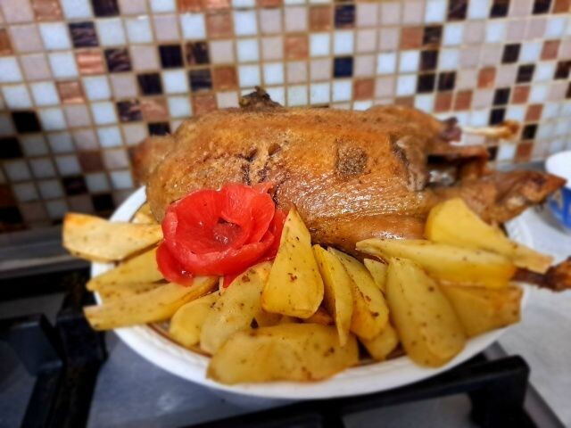 Татар халкының бер генә бәйрәме, туе кыздырган каз-үрдәктән башка үтми. Үземнең рецепт белән бүлешим әле. Бик тәмле килеп чыга. 1 каз өчен 10 литр суга 1 кг тоз салып, эремә ясыйсың һәм казны шул суга 1 тәүлеккә калдырасың. Аннан соң тозлы судан алып алдан әзерләнгән катнашма сылыйсың. Катнашманы түбәндәгечә әзерлим: бер чынаякка 1 чәй калагы адҗика, 1 аш калагы бал, 1 аш калагы соевый соус, 3 аш калагы майонез, 3-4 тырнак сарымсак, 1 пачка тавык өчен приправа, 1 әфлисуннын суы, барысын бергә болгатып, казның эчке һәм тышкы ягын яхшылап сылап 10-12 сәгатькә калдырам бүлмәдә. Аннан соң рукав для запеканиягә казны урнаштырып, 180- 200 гралуслы духовкада 2-2,5 сәгать пешерәсе (пакетның өстен берничә урыннан тишкәләргә кирәк). Пешеп җитәр алдыннан, рукавның өстен кисеп, каз кызарып матур булып пешсен өчен 10-15 минут тотасы. Үрдәк булса, газ мичендә әзрәк тотасы.