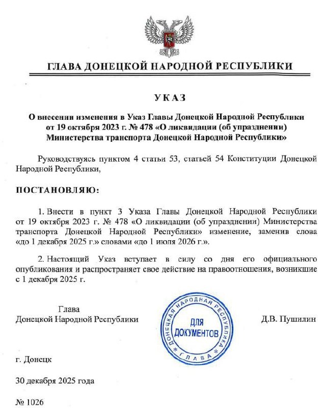 Пушилин продлил ликвидацию Министерства транспорта ДНР до 1 июля 2026 года