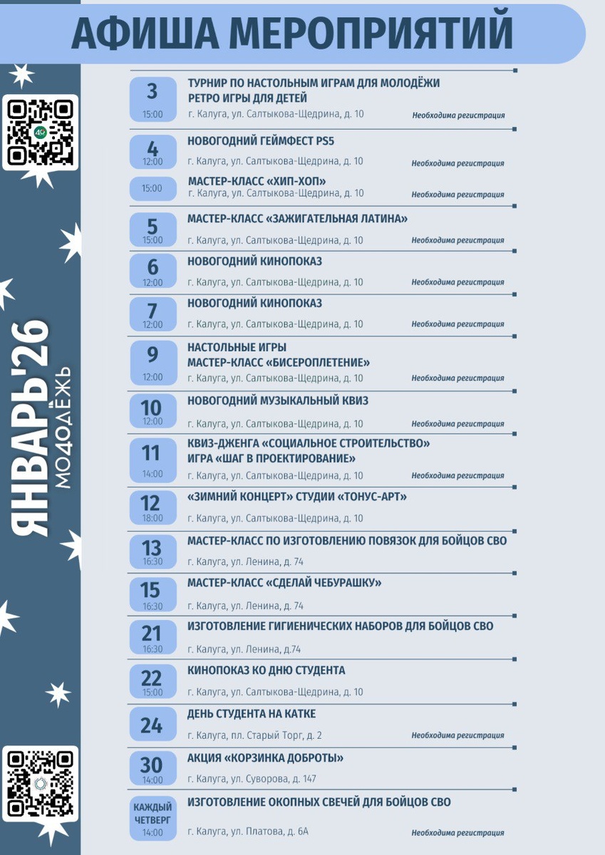 ? 🌸 Январь — время, когда можно сделать уверенный шаг вперёд навстречу новым открытиям! ➡️ Подготовили для вас афишу месяца от #Молодёжь40! Посещай мероприятия, не упуская возможности зарядиться энергией и познакомиться с новыми людьми. 🌌 Вход на мероприятия свободный. В афише возможны изменения. #Молодёжь40