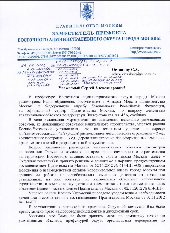 К Сергею Останину из посёлка Косино-Ухтомский уже неоднократно приезжала бригада, облечённая властью, демонтажными инструментами и с экскаватором во главе. Представитель Управы Косино-Ухтомского района Анна Баранова бегала от Останина, начальник отдела демонтажа Денис Федюкин только словесно подтверждал законность проводимых работ, полиция безмолвствовала, когда рабочие проводили разрушительные работы. Демонтаж построек по улице Златоустовская д. 45 А происходил 4, 5 и 6 декабря. Стоит отметить, что снос в принципе происходил при весьма сомнительных обстоятельствах — Останин так и не смог получить документацию, подтверждающую правовые основания для совершаемых против него действий. Не было протокола Окружной комиссии, не было постановления о признании строений и жилого дома незаконными, судебного акта о признании жилого дома (с кадастровым номером) самовольно построенным капитальным строением. Не было ничего. Тем не менее, экскаватор под прикрытием высоких чиновников, нанёс реальный у