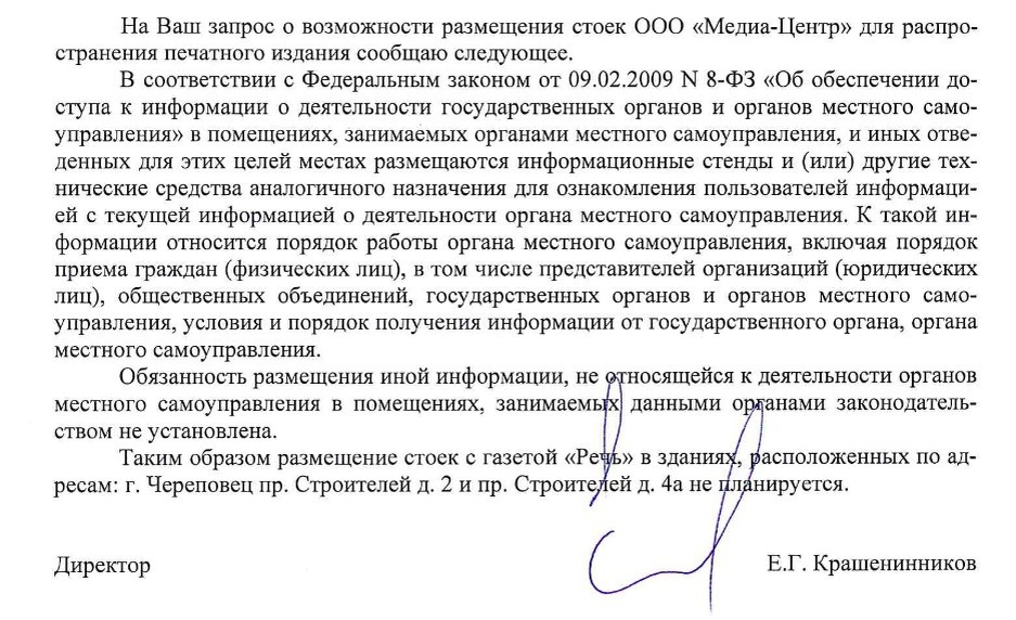 » Редакции обеих газет направили в мэрию запрос о размещении стоек с нашими газетами в зданиях на Строителей, 2 и Строителей, 4а. Нам отказали. Потому что «обязанность размещения иной информации, не относящейся к деятельности органов местного самоуправления в помещениях, занимаемых данными органами, законодательством не установлена». Что ж. Мы спросили - нам ответили. Хотя по той же логике могли и разрешить. Ведь если законом не установлено, значит, не запрещено 😉