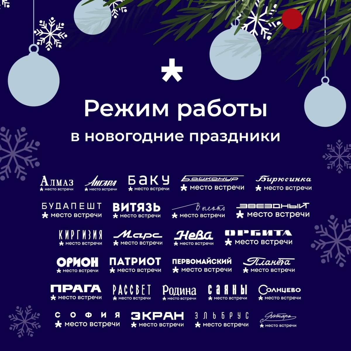 ! 🕒 Чтобы удобно спланировать дела в праздники и всё успеть, обратите внимание на график работы районных центров «Место встречи». Часы работы будут указаны на сайтах ваших РЦ. Желаем вам уютного, спокойного и по-настоящему праздничного Нового года ✨