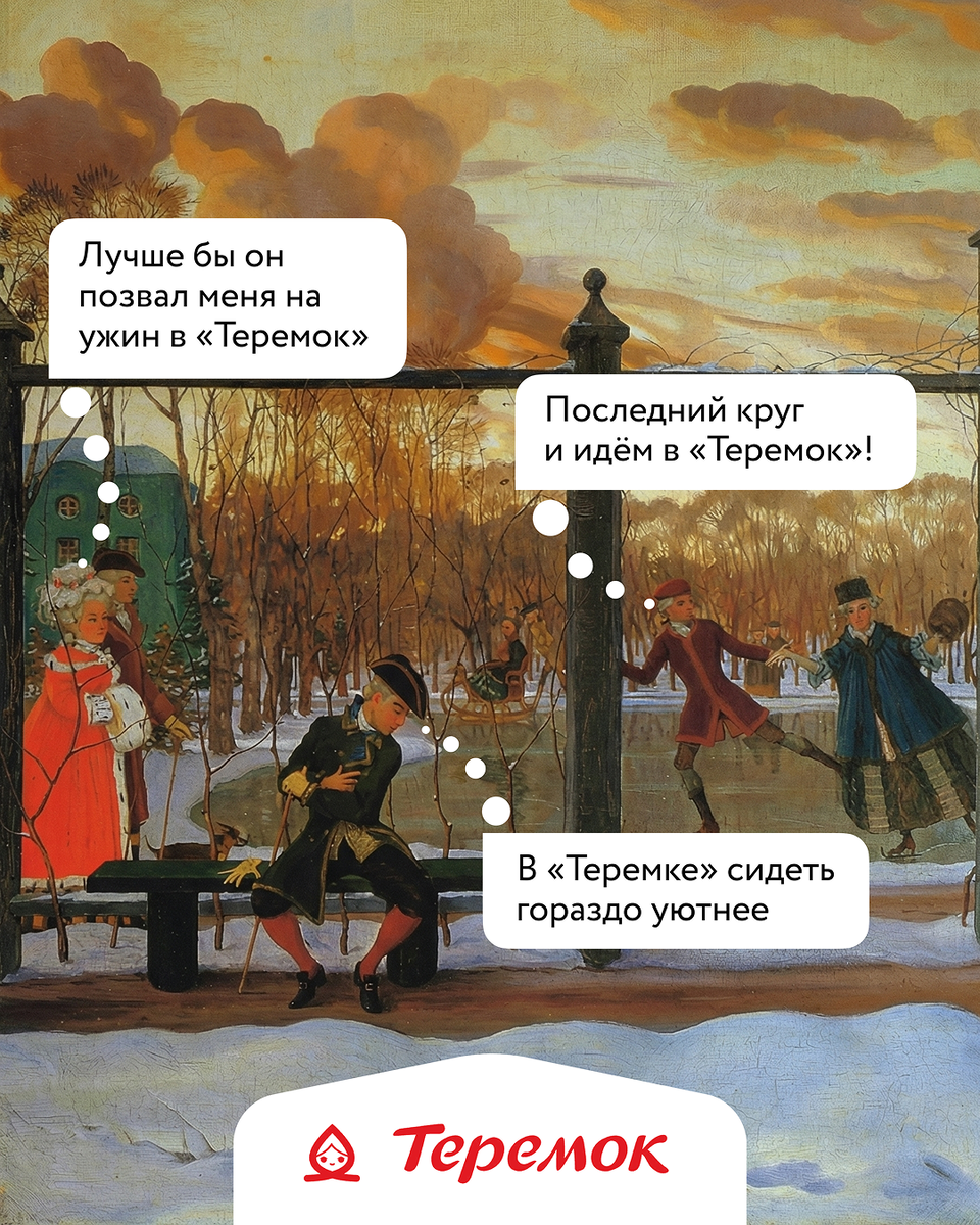 Судари и сударыни, а ведь у картины мог бы быть и такой сюжет! Пока все делают вид, что наслаждаются светским раутом на льду, их настоящие мысли крутятся вокруг горячих блинов и уютной атмосферы «Теремка» ❤️ #ВашаМаруся #ТеремокВкусно